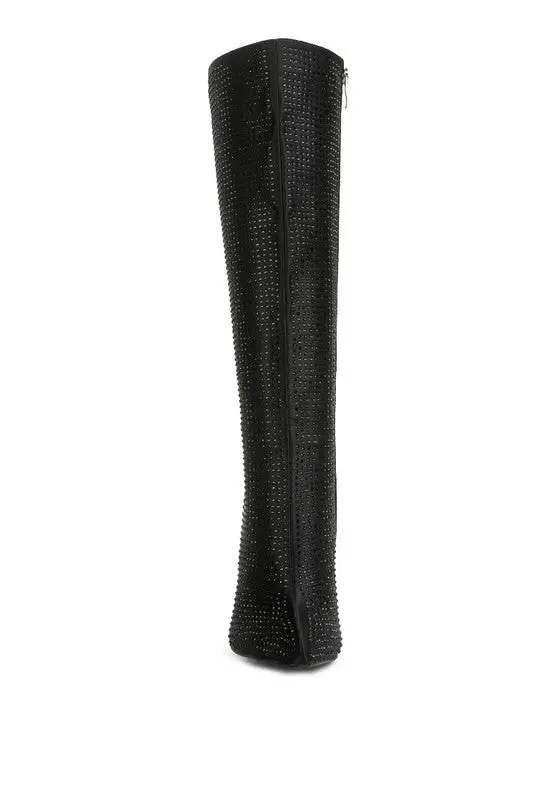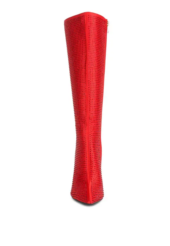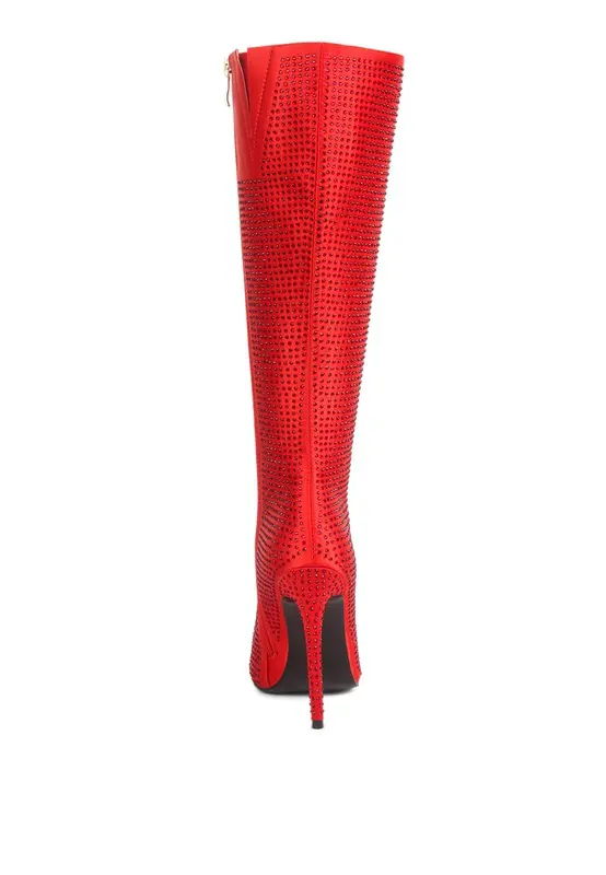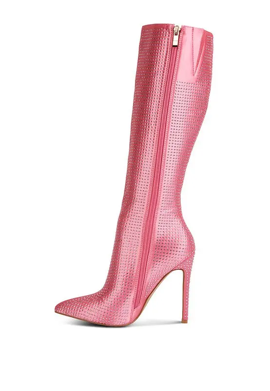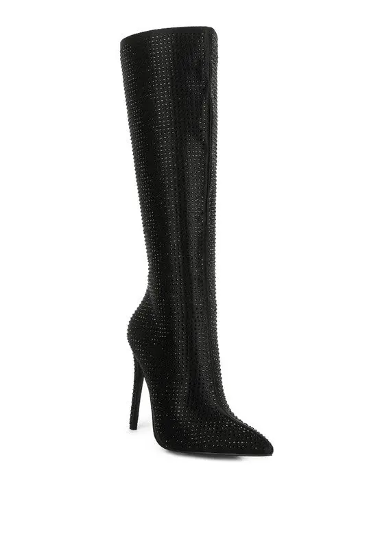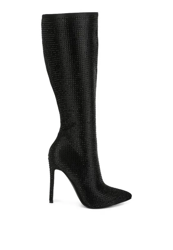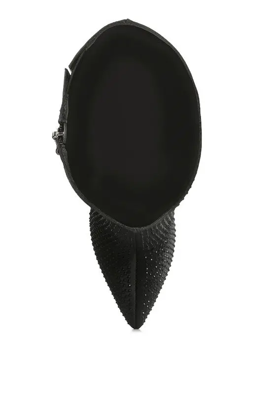 High Pointed heel boot with heat set diamante shines you through the party! It comes with an inside zipper opening which makes it easy to wear. The pointed heel and pointed toe in this calf boot make it chic!