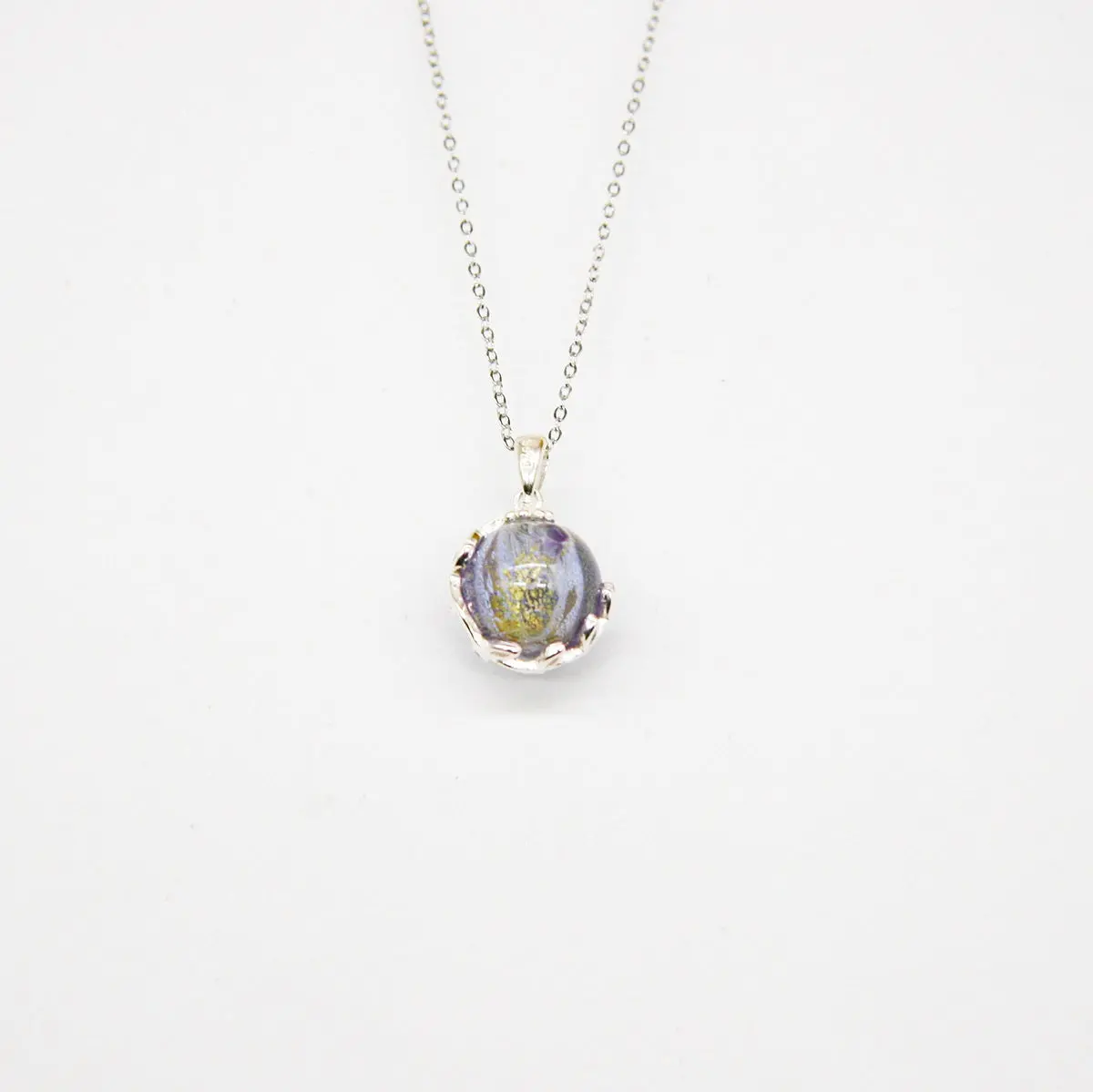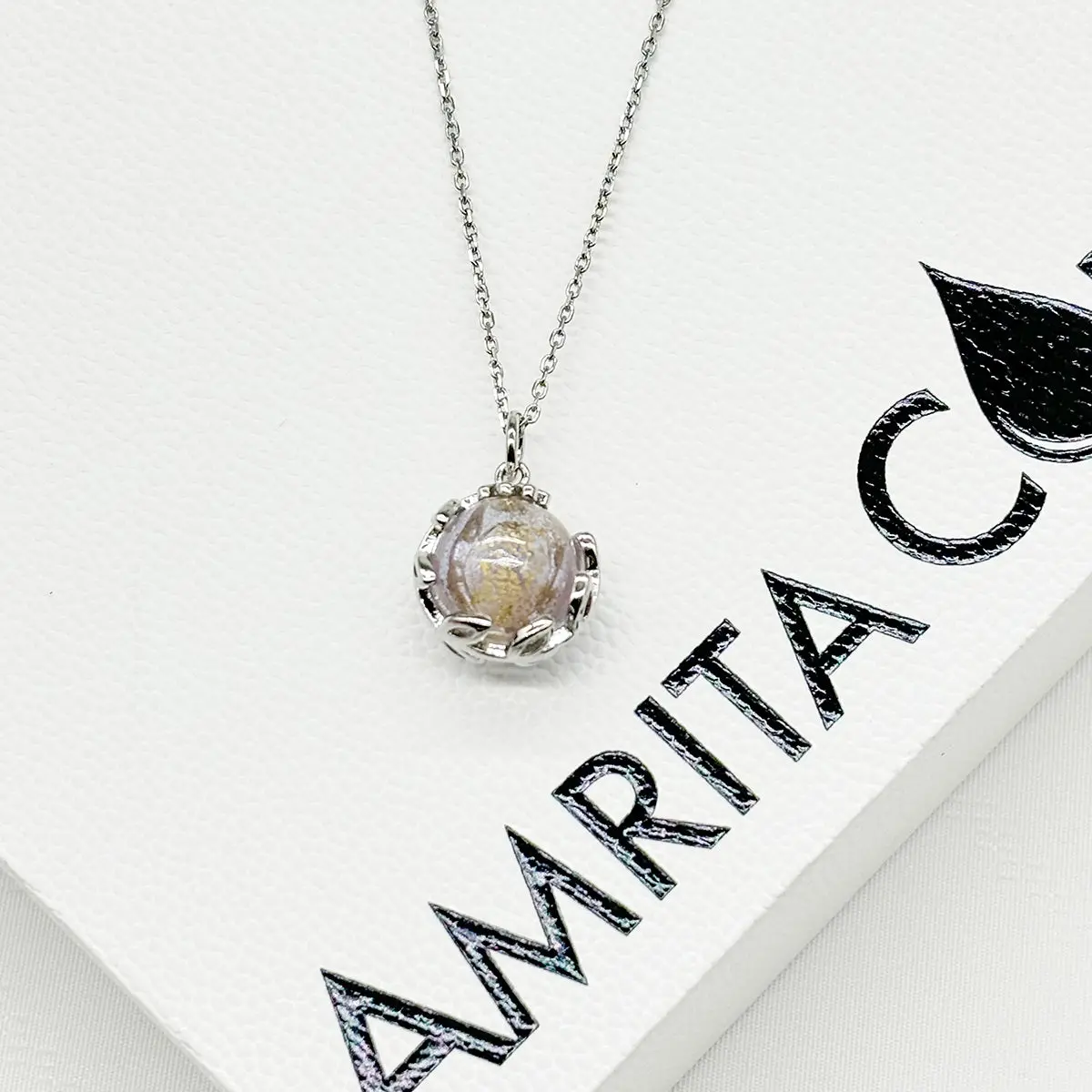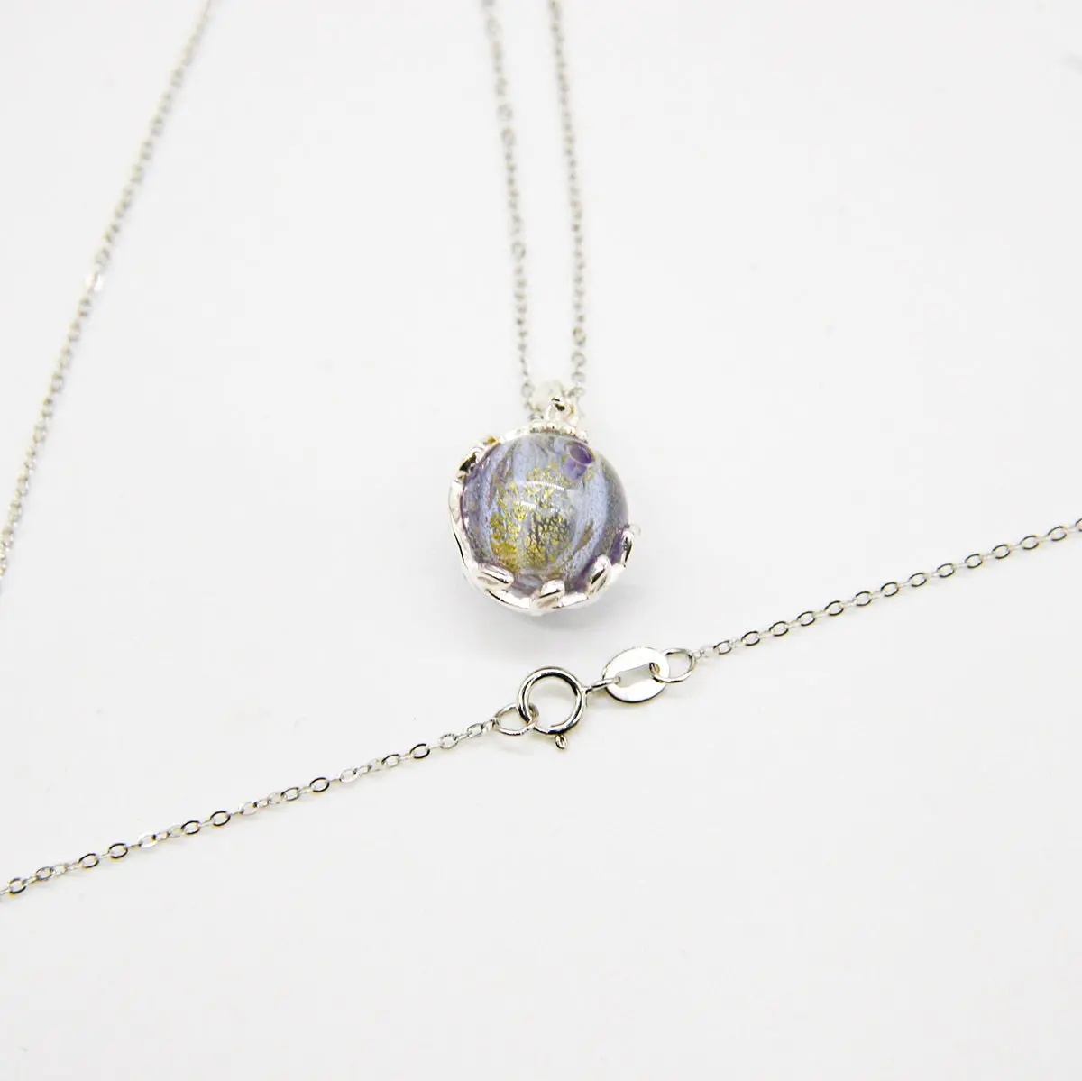 Elevate your style with our stunning new Planet Aroma Necklace in Purple Lavender with Golden Flakes, a harmonious blend of exquisite design and timeless aroma. Crafted with care, the pendant and chain gleam in 18k white gold plating, while the Murano glass pieces are meticulously hand-blown, each adorned with delicate gold flakes resembling celestial bodies with beauty beyond imagination.