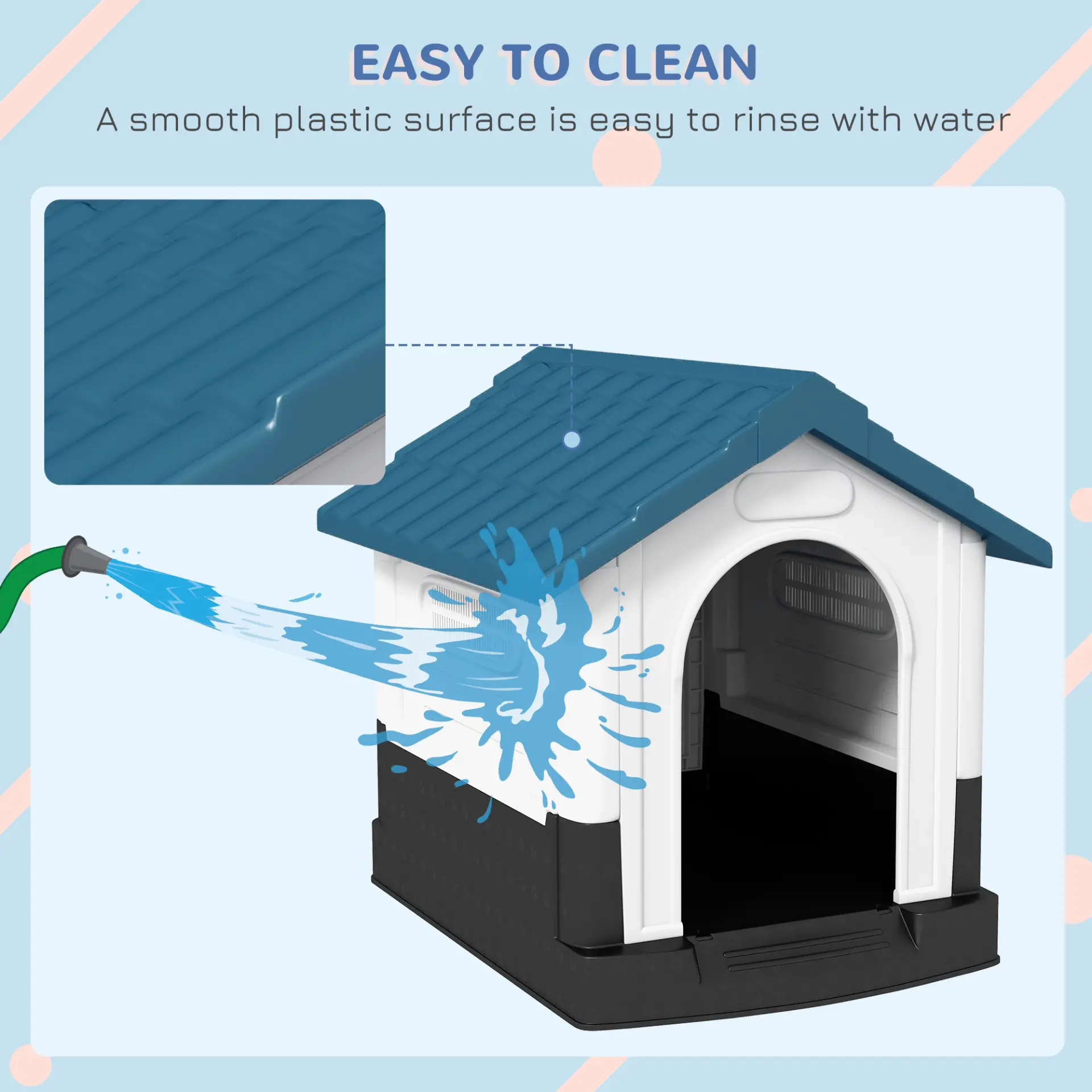 - Slanted roof: When raining, the water slides straight off, preventing any build up and keeping their space dry. On hotter days, the roof provides a cool and comfortable shade for pets to enjoy.