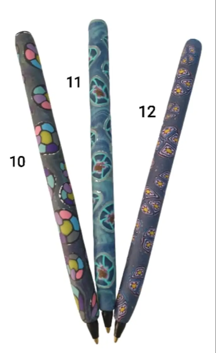 Hand Made in Israel n nHand sculpted polymer clay refillable pens. nAssorted colors! n nErgonomically designed -comfortable in the hand n- Great gift idea! n nPlease select style number n nAll pens are Bic Round Stic™, covered in hardened polymer clay. To replace empty ink refill, take a small pair of pliers, grip ink cartridge at base, and pull out. Keep pens in a cool, dry place, to avoid drying out and overheating. nPrice is per each pen