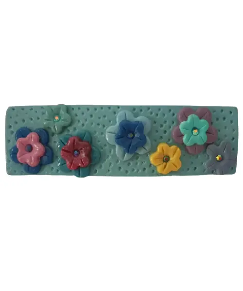 Hand made in Israel n nCute Polymer Clay colorful floral turquoise barrette with small flowers. nSturdy French made clasp. n nOne of a kind n n6 cm. base