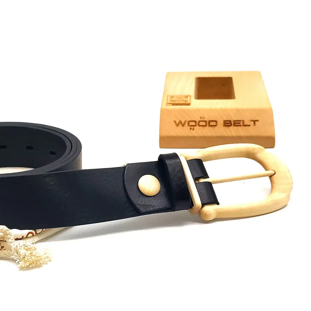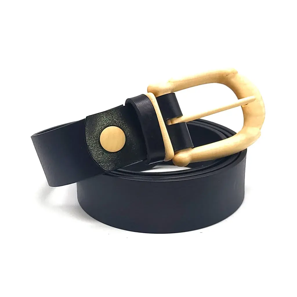 A unique combination of the wooden buckle with classic casual leather 40 mm wide belt is excellent and never out of fashion.
