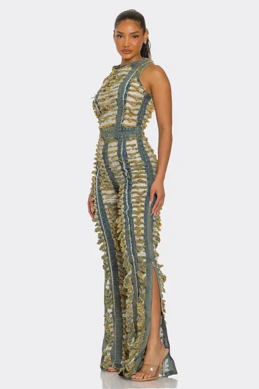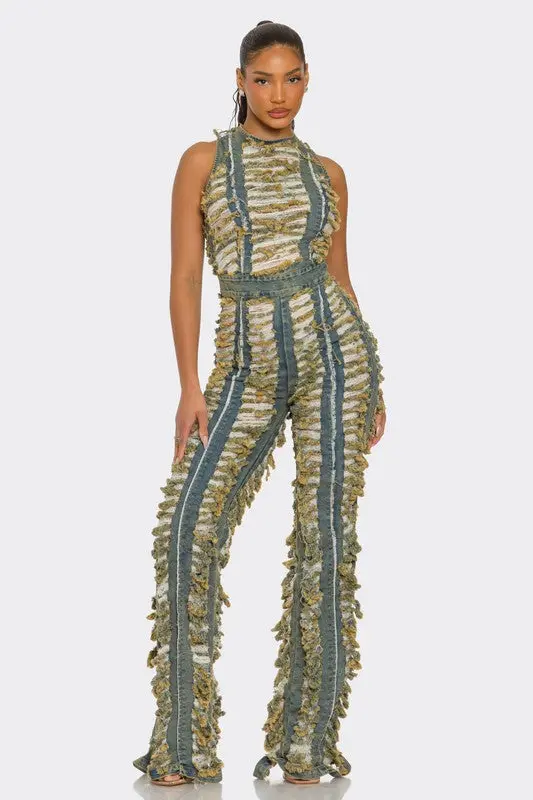 Make a fierce fashion statement with the Raw Edge Frayed Denim Jumpsuit, a daring blend of edgy texture and sleek silhouette. Designed with intricate distressed frayed paneling, this sleeveless jumpsuit hugs the body in all the right places while elongating the legs with its dramatic flared design. The high neckline adds a touch of sophistication, balancing the rugged, deconstructed look. Perfect for trendsetters who love to stand out, this jumpsuit brings runway energy to street style.