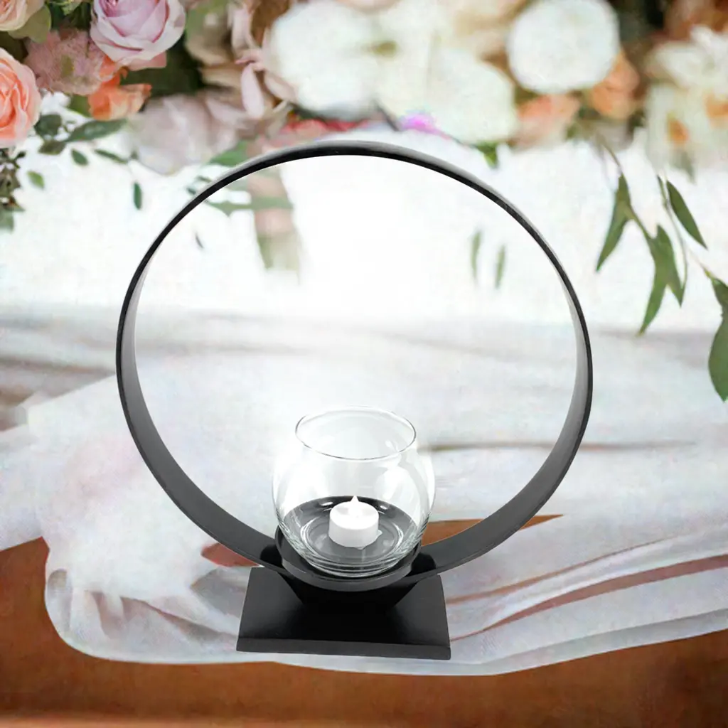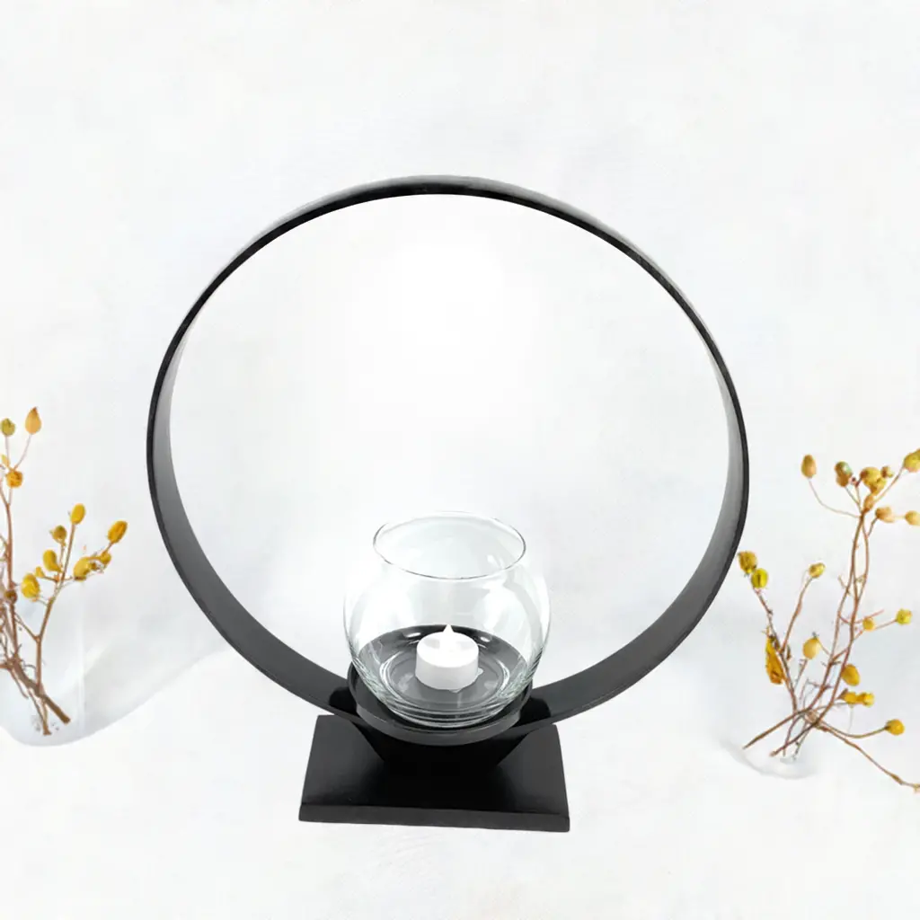 Made of metal: Aluminum, Finish: Rustic Black finish Finish: Rustic Black finish Size: Height – 14.5, Width 12.5, Weight 35.2 OZ It has perfect space to place 3.5 diameter candle Indoor use only. Create a cozy and rustic ambiance in your home with this stylish and sturdy Ring Candle Holder in Rustic Black. Made of durable metal and designed with a sleek finish, this candle holder stands at a height of 14.5 inches and measures 12.5 inches in width, making it the ideal size for any indoor space. Its perfect fit for 3.5-inch diameter candles ensures that you can easily add a warm and inviting glow to any room. Bring some charm and sophistication into your home with this must-have candle holder.