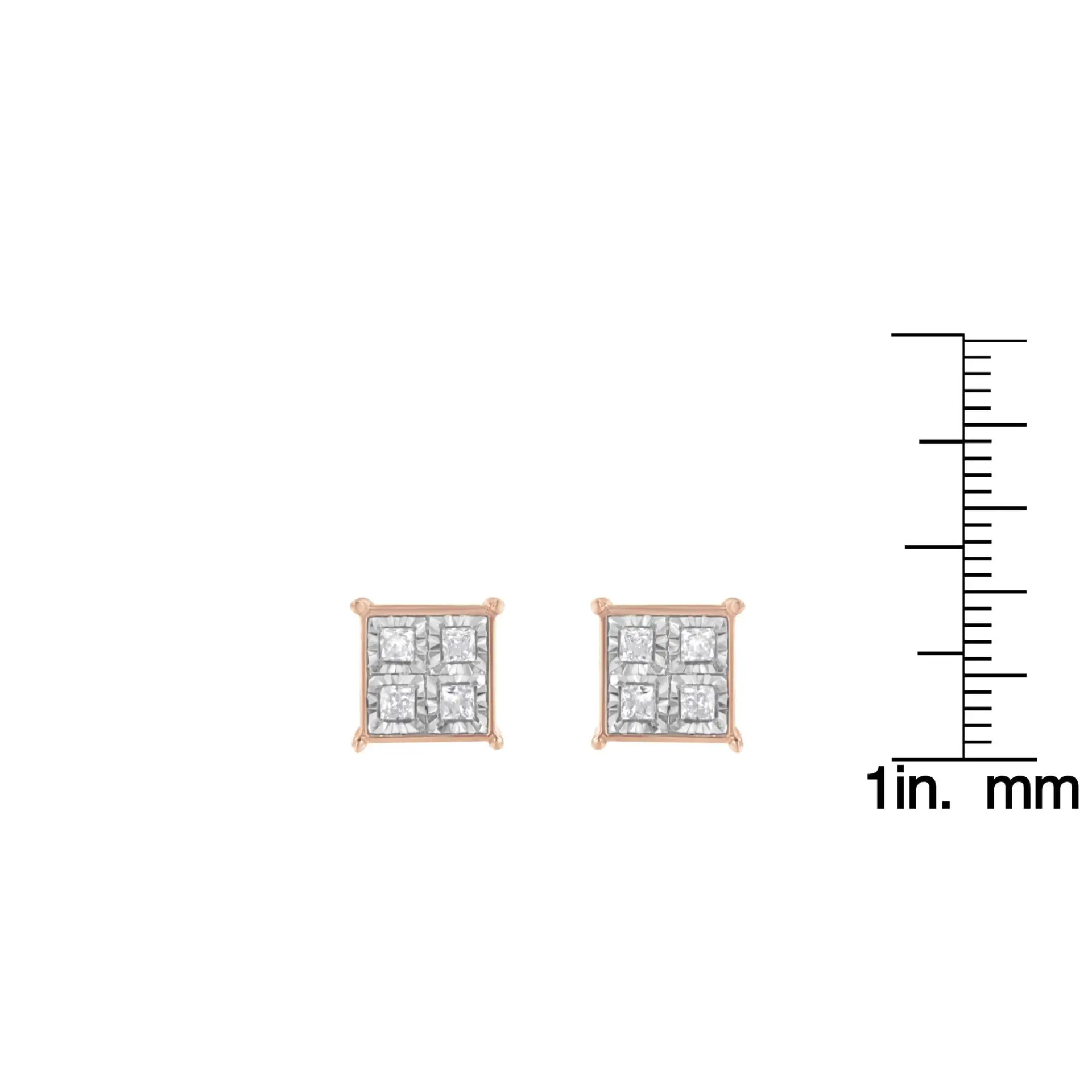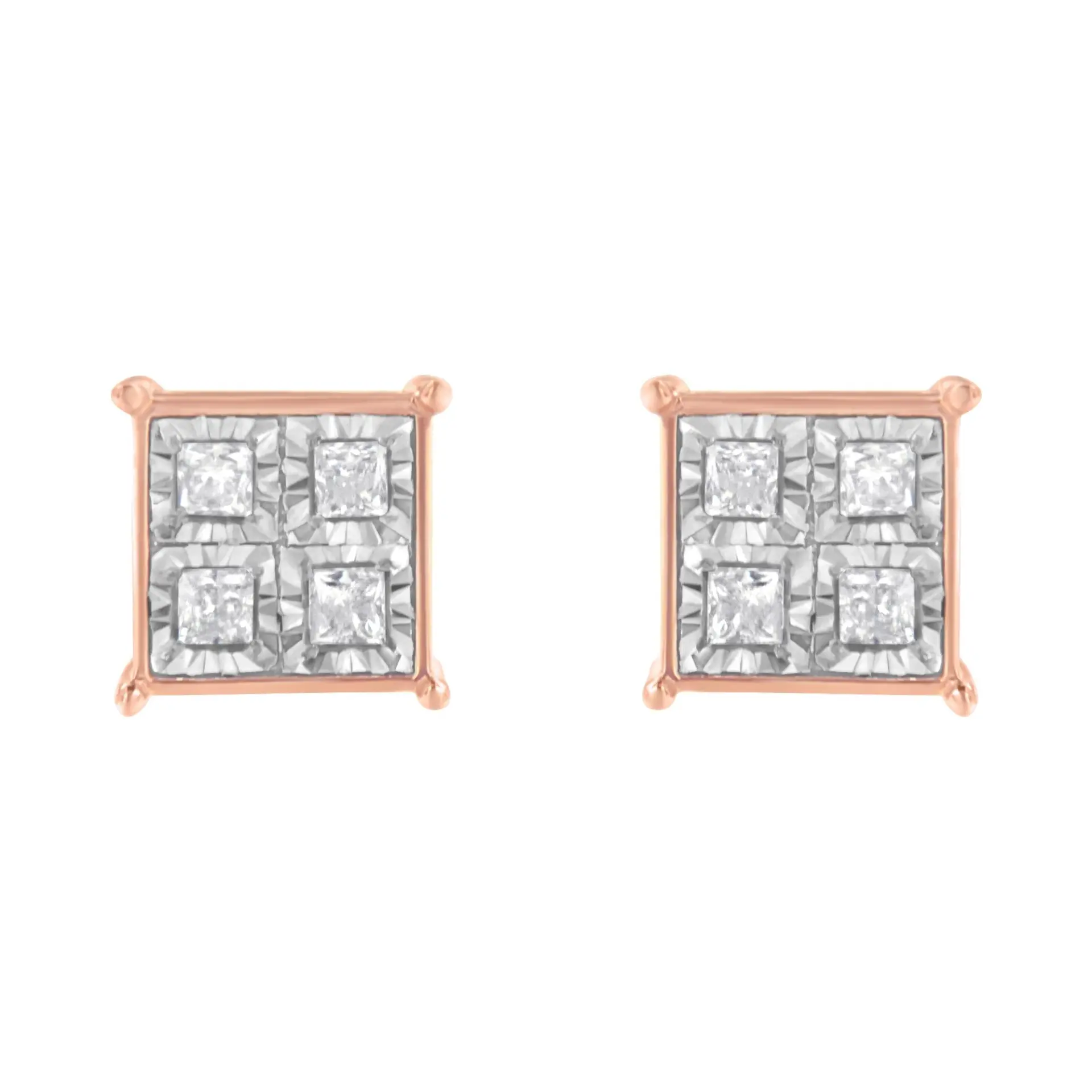 Fashioned in rose plated sterling silver these classic 3/4ct diamonds studs are a must have. Each earring showcases four miracle set princess cut diamonds neatly arranged in a square frame. The design is finished of with a secure back mechanism.