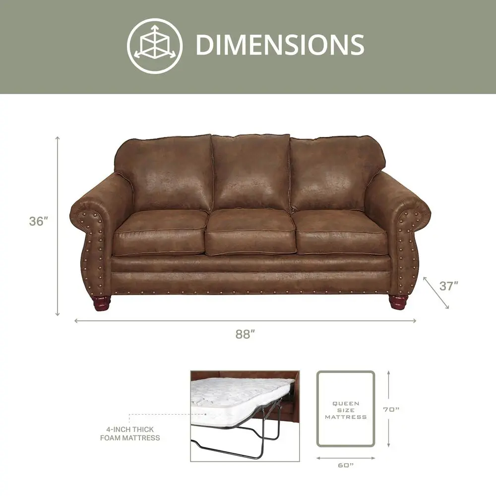 Leather look solid color microfiber Solid wood frame will last for years Comfortable foam seat and back cushions are wrapped with fiber for a comfortable seat Nail head accents bring a rustic look to this group Leggett & Platt mechanism Queen Mattress: 60″ W x 70″D x 4″H Inner spring, quilted top queen mattress Bed mechanism allows both a totally flat bed or a slightly elevated head rest position for tv viewing or reading