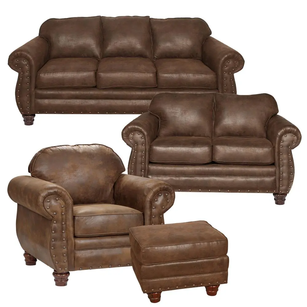 The Sedona sleeper set features a beautiful leather-look microfiber fabric with rustic antique brass nailhead accents. Solid wood frames and legs create a product that will last for years, and the curved arm design softens this set with elegance. Fiber wrapped, high density foam cushions offer a soft but supportive seating experience. This set includes sofa, loveseat, chair, and ottoman. The sleeper sofa includes an inner spring, quilted top queen mattress and features a Leggett & Platt mechanism.