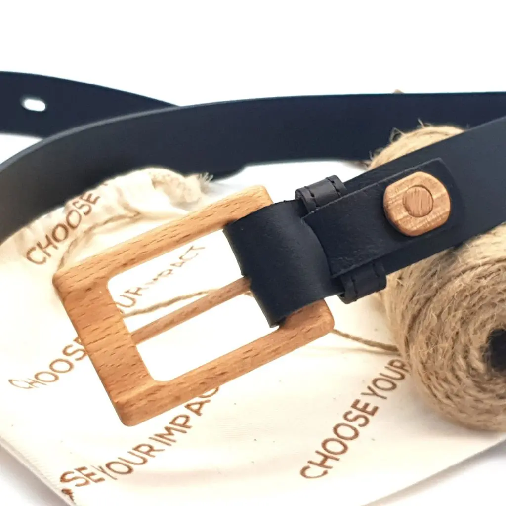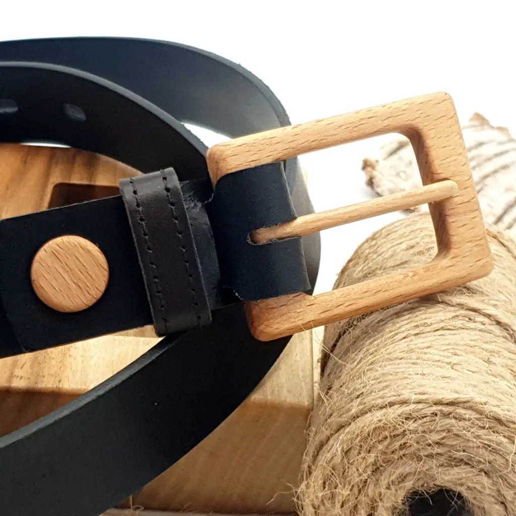 Clever craftsmanship solution to fix wooden buckles made of used wood offcuts to the belt.