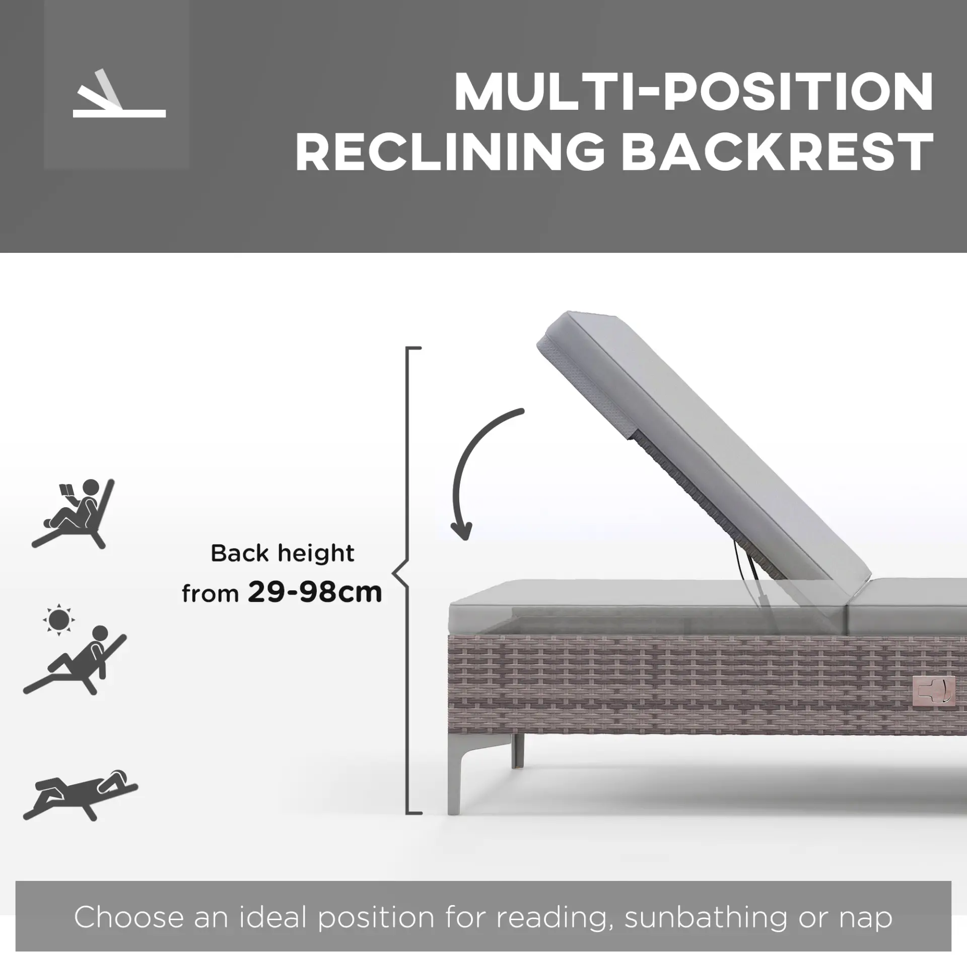 Comfortable lounging outdoors, made easy. This Outsunny piece is perfect for getting your hit of sun when it comes out to shine. The long design holds all your body. The frame is made from steel for a strong core, wrapped in plastic wicker for double the protection – and a stylish rattan look. Set the back between 29-98cm – the air rod makes it is to adjust into place. Comes with a top cushion to keep you comfortable.