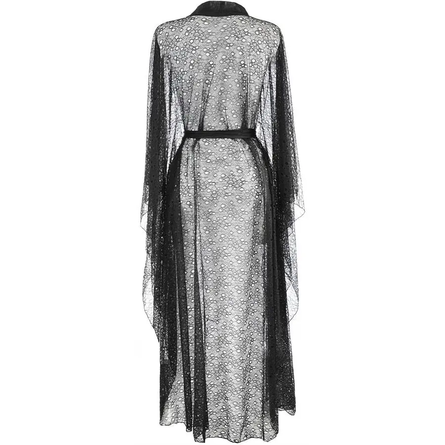 Experience the ultimate in luxurious comfort lace peniuar by Axami Lingerie. Indulge in luxurious comfort and seductive style, this nightgown is made from the highest quality delicate fabrics. This nightgown will awaken your imagination and arouse your senses with its delicate transparent pattern of richly decorated black lace. The long sleeves and belt tie closure add a touch of elegance and sophistication, while the tulle and shiny strip on the hem allow you to adjust the fit to your liking.