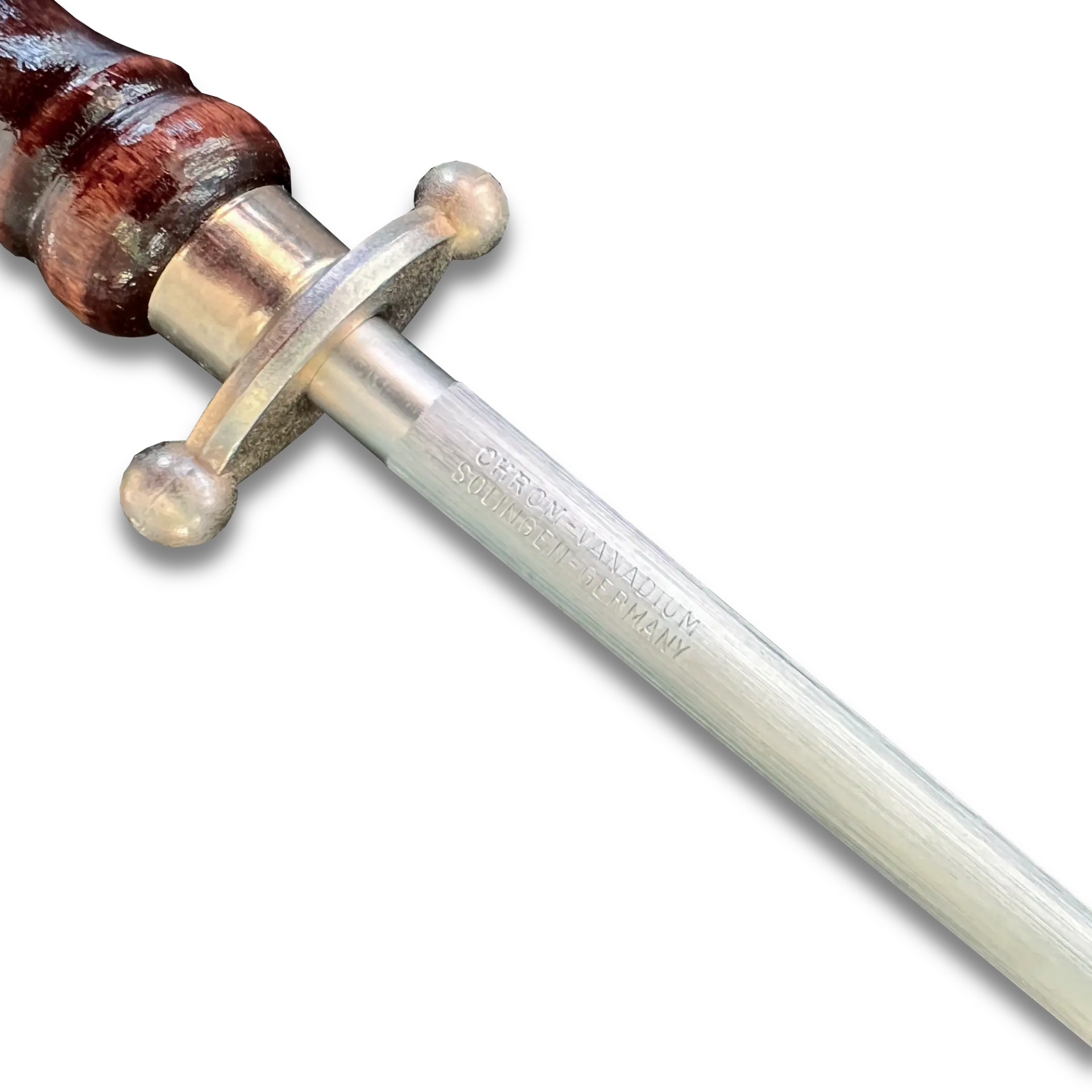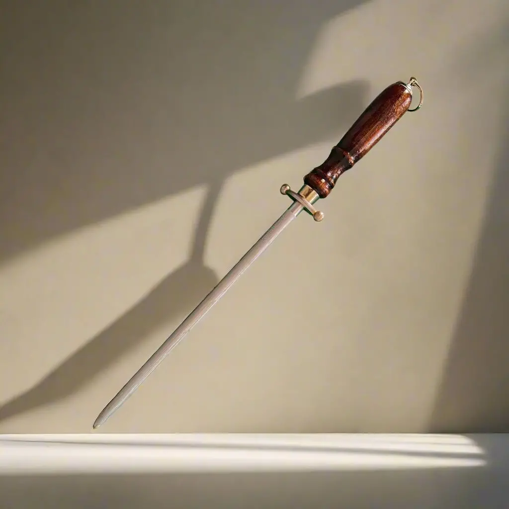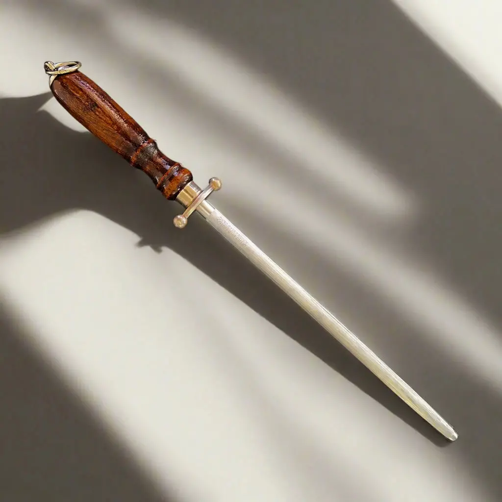Introducing the Grohmann Sharpening Steel German Chrome-Vanadium, a premium blade maintenance tool crafted with precision in Solingen, Germanya city celebrated for its rich heritage in producing world-class cutlery. This sharpening steel features a cutting-edge Chrome-Vanadium alloy, renowned for its exceptional hardness and resistance to corrosion, ensuring both durability and superior sharpening performance.