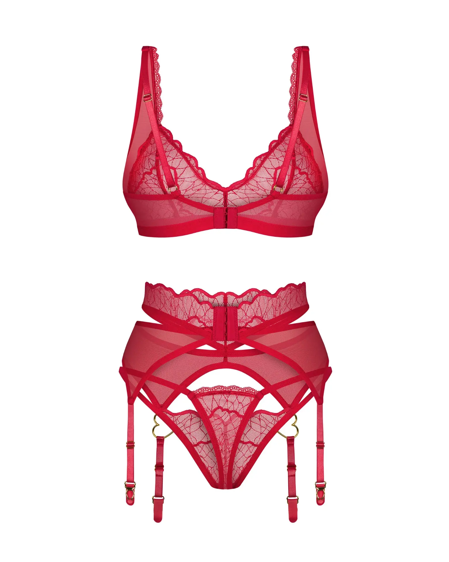 - Sensual sheer lace set: wireless bralette, thong & garter belt.
