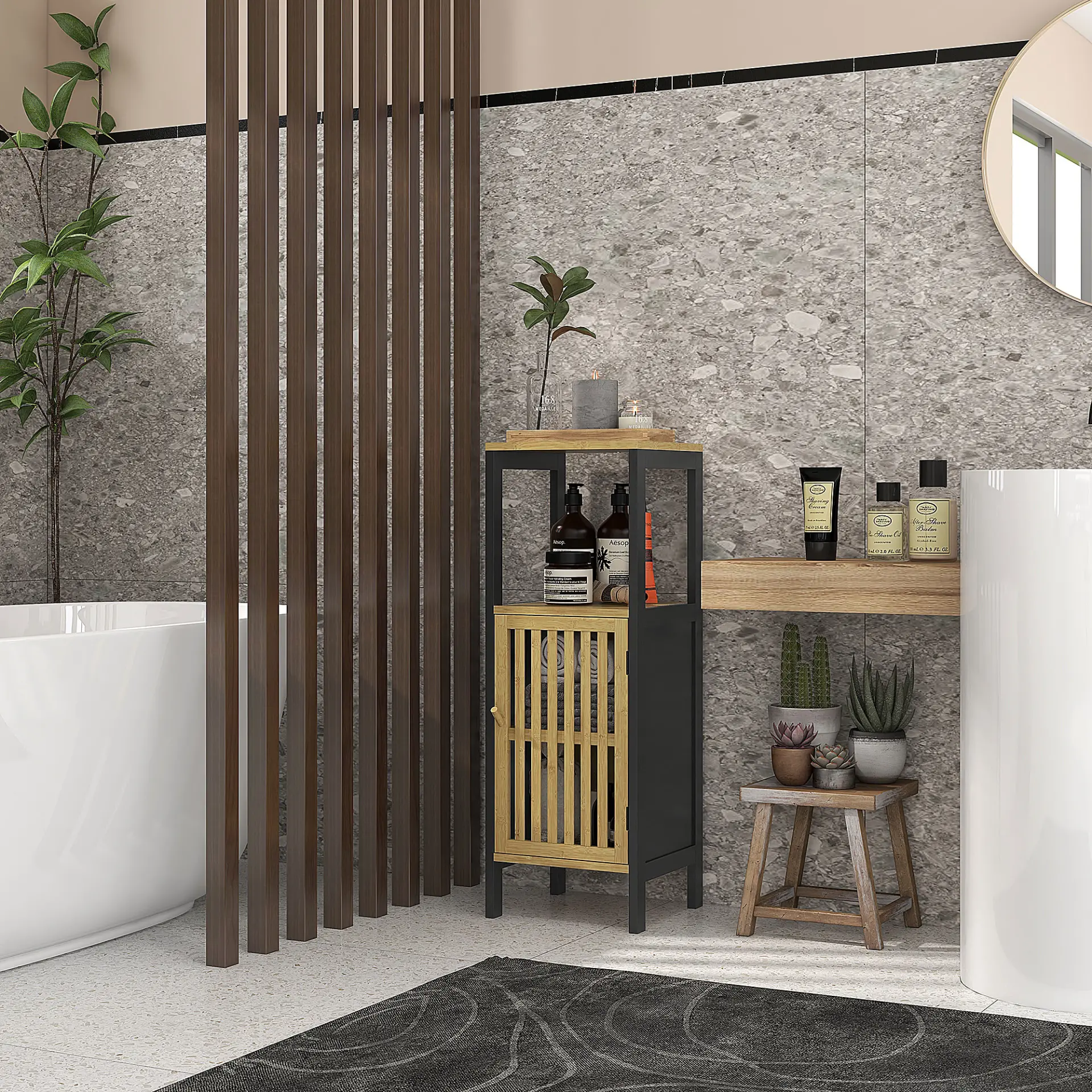 Slim Bathroom Storage Cabinet, Small Bamboo Bathroom Cabinet with Open Compartment and Adjustable Shelf, Black | HOMCOM