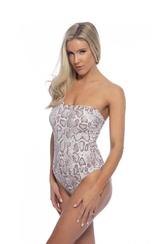 Snakeskin printed one piece with one shoulder adjustable tie strap, removable pads, moderate coverage. Seamless in soft microfiber material, stretch fit.
