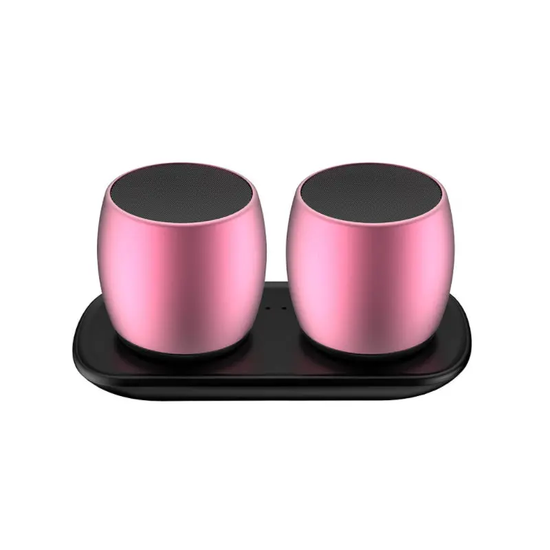 This dual speaker can play individually or as a duet to gather, creating a 3D surround sound. These powerful mini speakers are shaped like a drum, have full Bass, and connect quickly to your Bluetooth device. Enjoy 4 hours of music or continuous music when played on the charging pods.