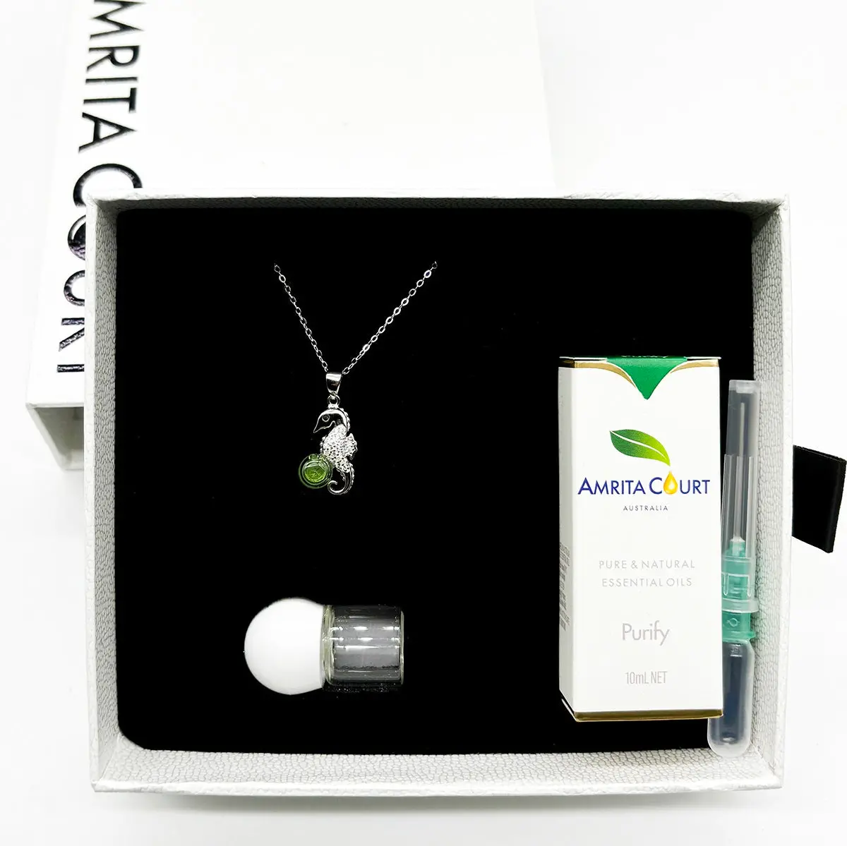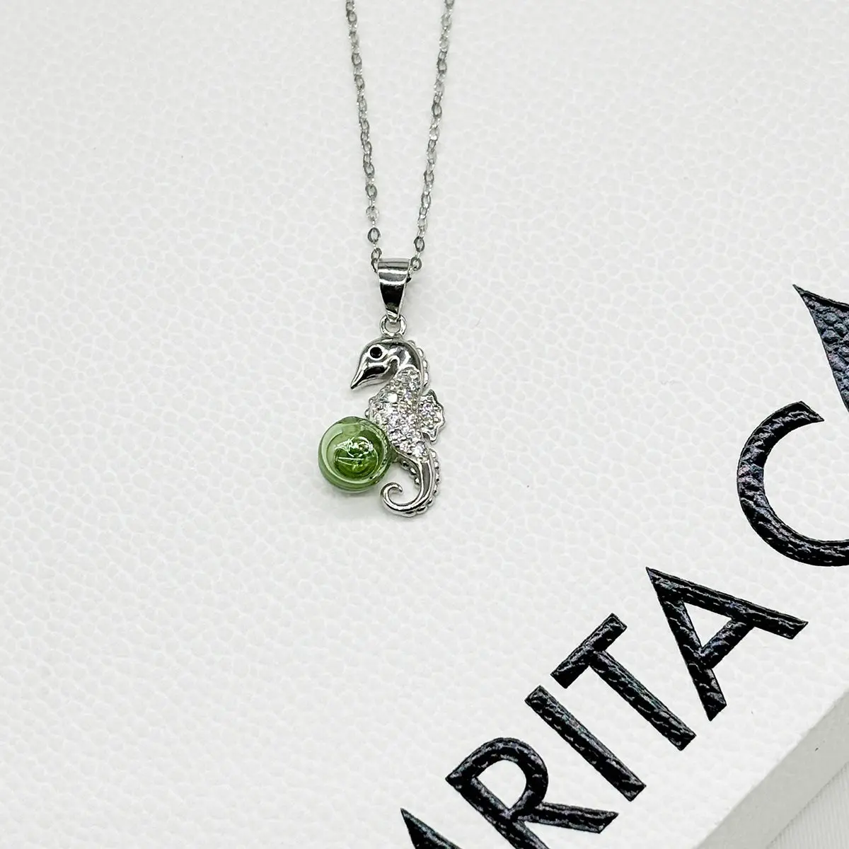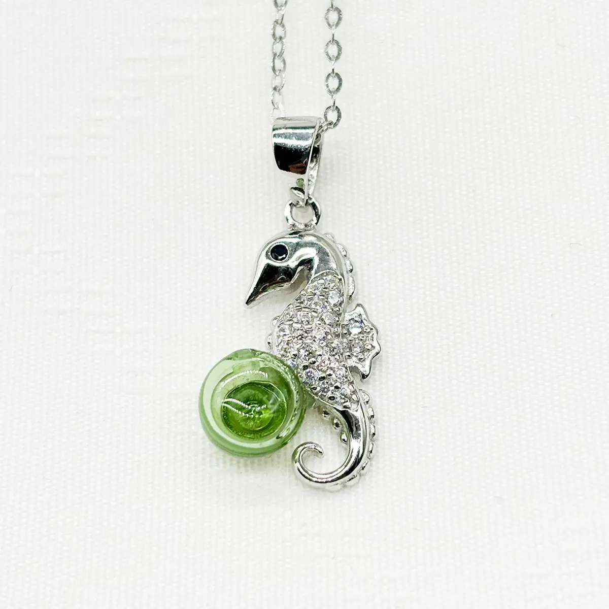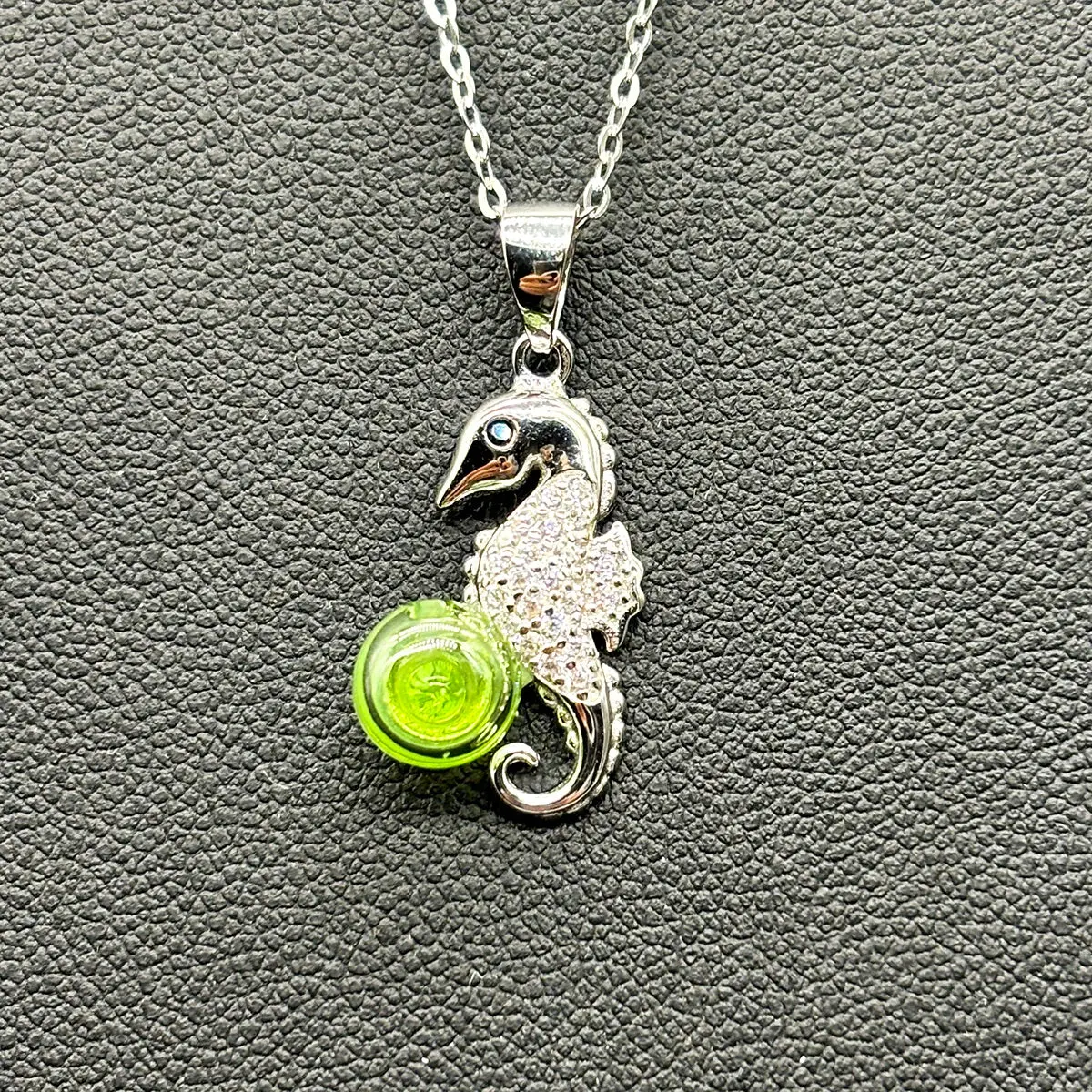 Elevate your style with our stunning new Sea Horse Aroma Necklace with lime ball, a harmonious blend of exquisite design and timeless aroma. Crafted with care, the pendant and chain gleam are purely Sterling silver (925 silver) adorned with beautiful white cubic zirconia stones, while the Murano glass pieces are meticulously hand-blown.