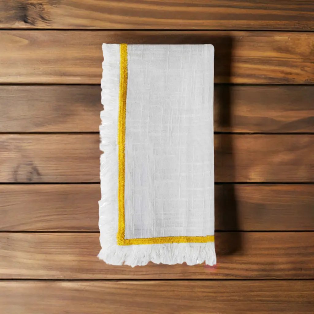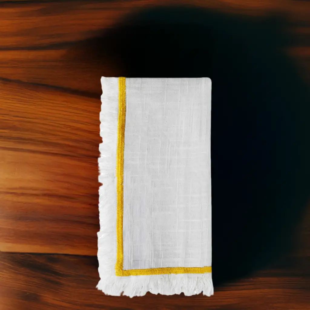These lovely table napkins are versatile and add a touch of sophistication to any occasion, whether it’s a party, shower, dinner, or everyday use. They also make a thoughtful gift for holidays, housewarmings, Mother’s Day, dinner parties, or birthdays. Remember to follow the care instructions to prevent shrinking. Our napkins are a small but impactful detail for your dining display and come in a set of 4, measuring 20″ x 20″. Made from 100% cotton, they can be placed left of the charger or elegantly folded with napkin rings on the dinner table. The yellow embroidery adds a beautiful and simple design to the sides of the napkins. Machine wash for convenience.