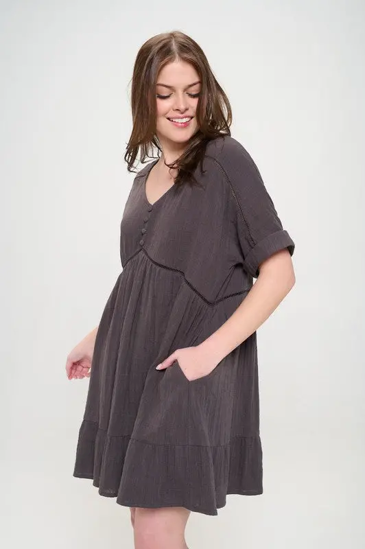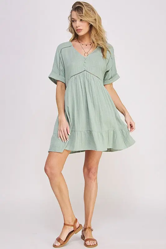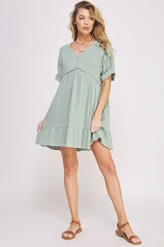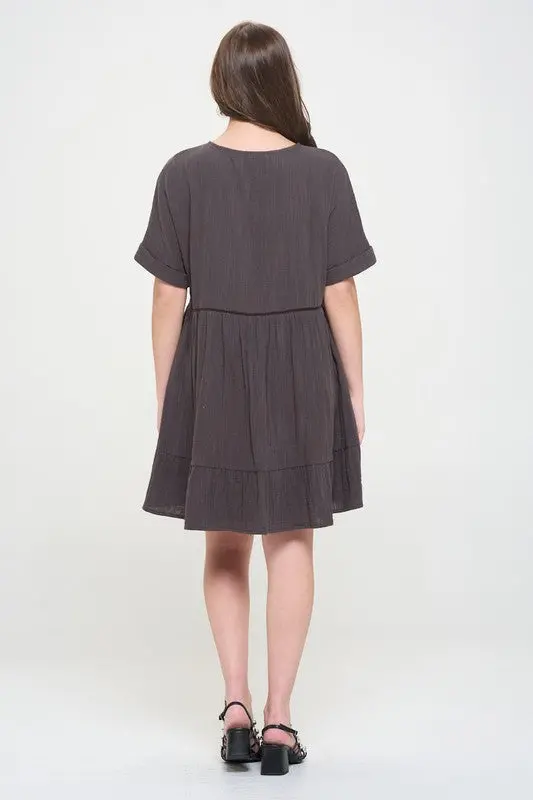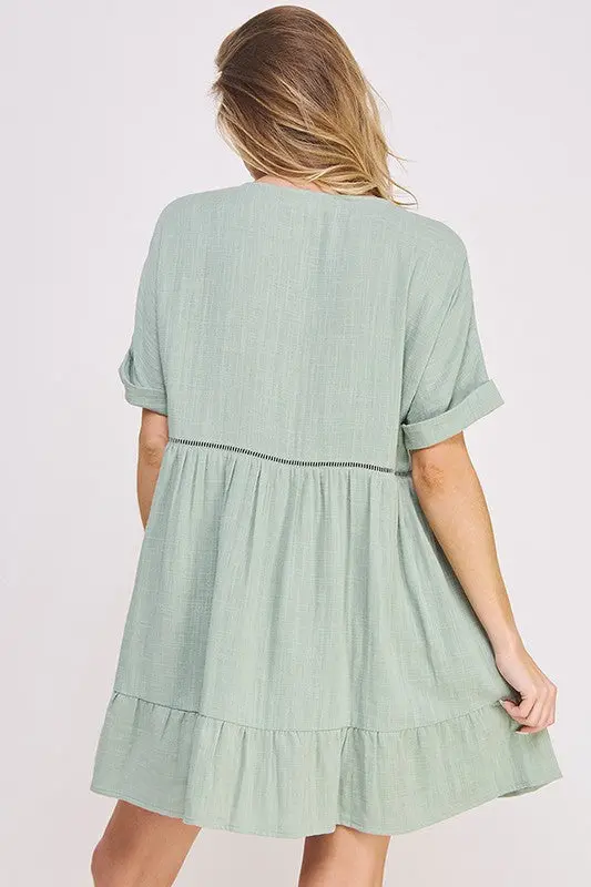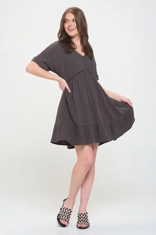 TEXTURED SHORT SLV BUTTON DOWN V-NECK SHORT DRESS