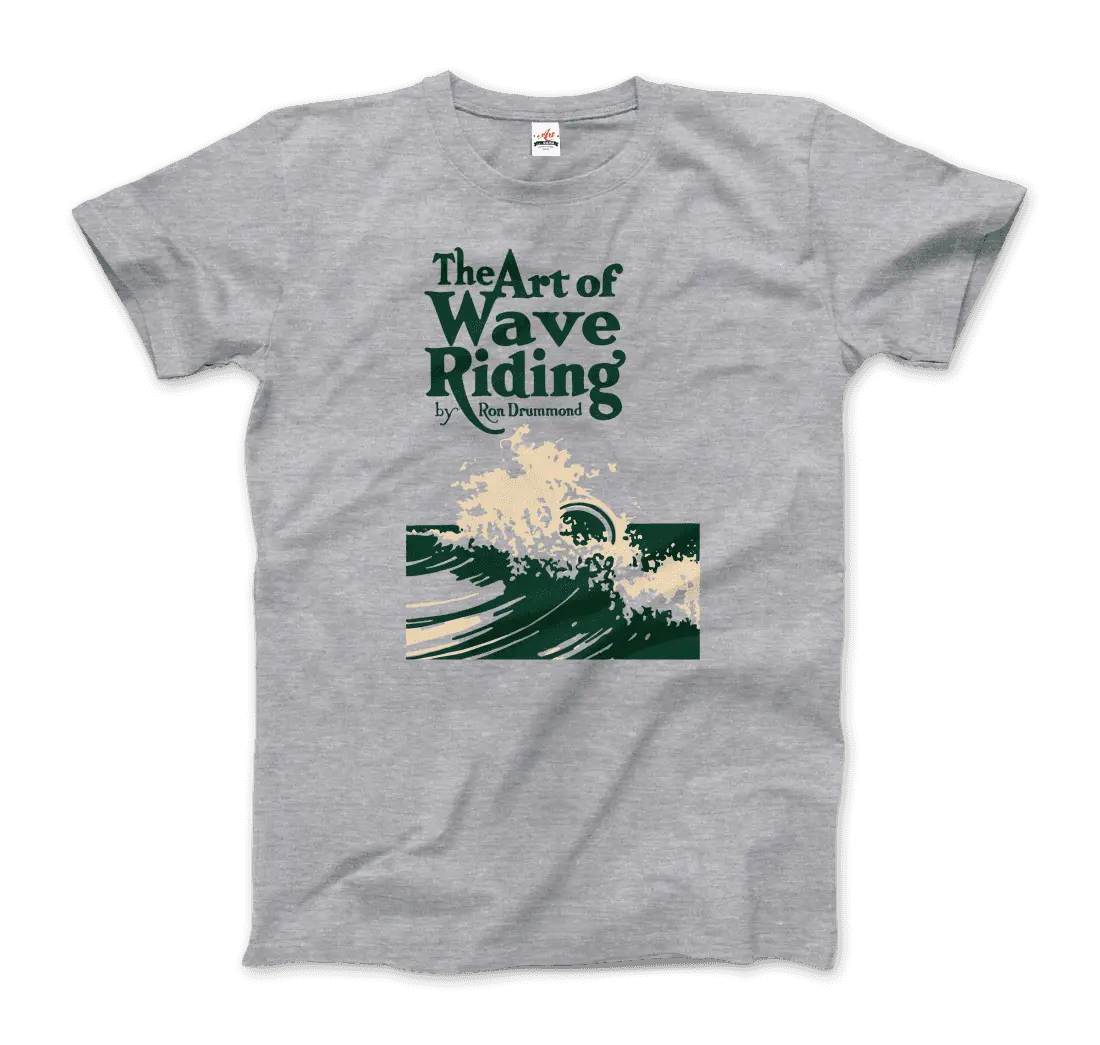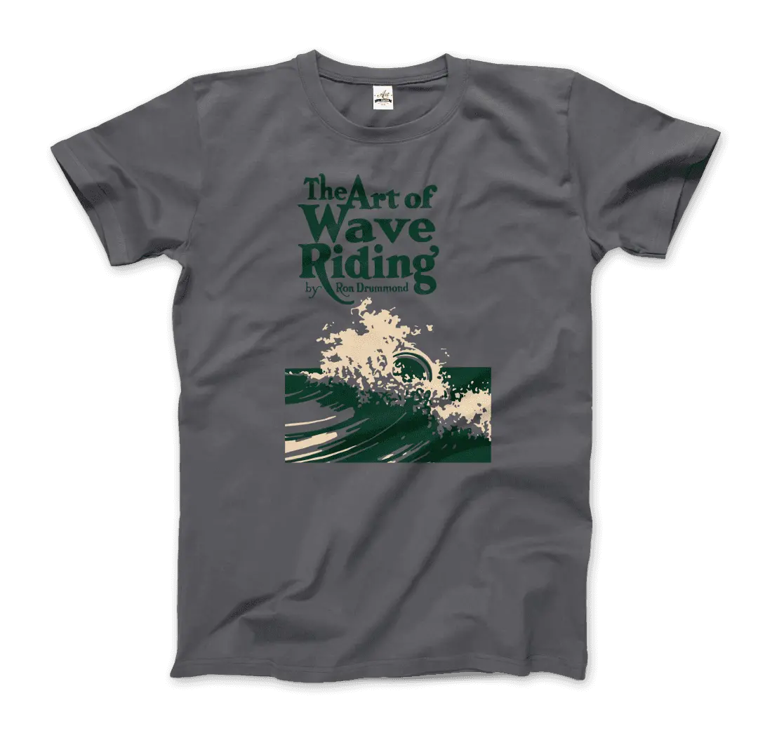 This tee carries theartfrom the cover of a classic surfing book, TheArt of Wave Riding, written by a former California lifeguard, Ron Drummond. It is a how-to manual that was one of the earliest attempts to legitimize the sport of bodysurfing.