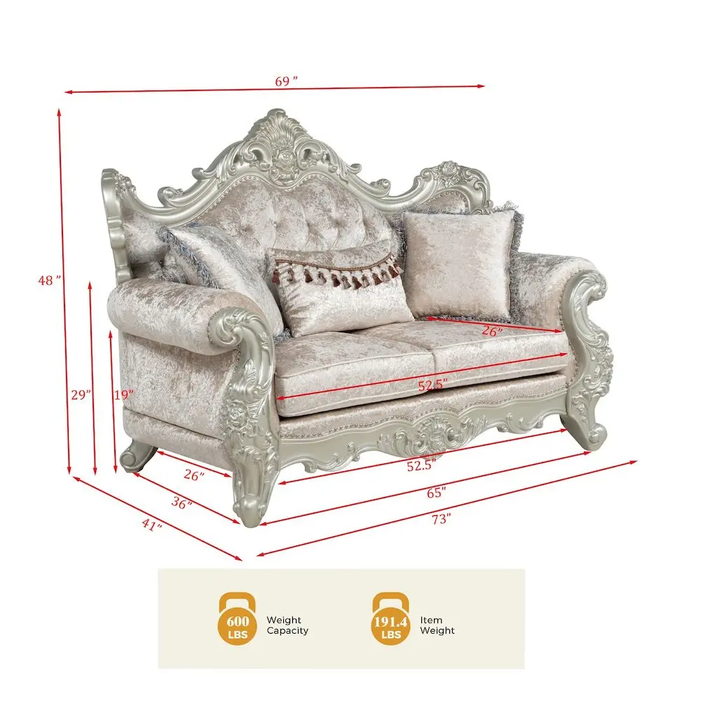 Invite timeless beauty into your living room with the Tlerra Victorian Traditional Loveseat. Measuring 71 inches, this classic two-seater showcases a tufted champagne fabric backrest and rolled armrests that evoke vintage grandeur. The hand-carved floral Spring Bud finish wood frame completes the elegant design. A refined centerpiece for traditional or Victorian-inspired interiors.