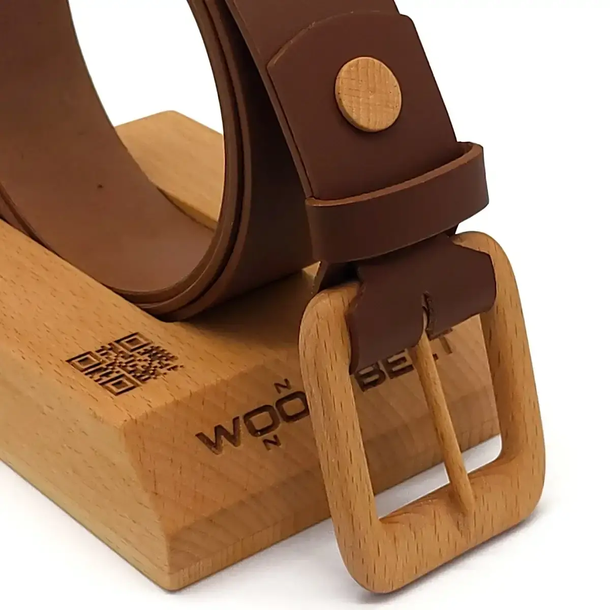 Innovative craftsmanship solution to fix designers wooden buckles made of used wood offcuts to the leather with a wooden plug.