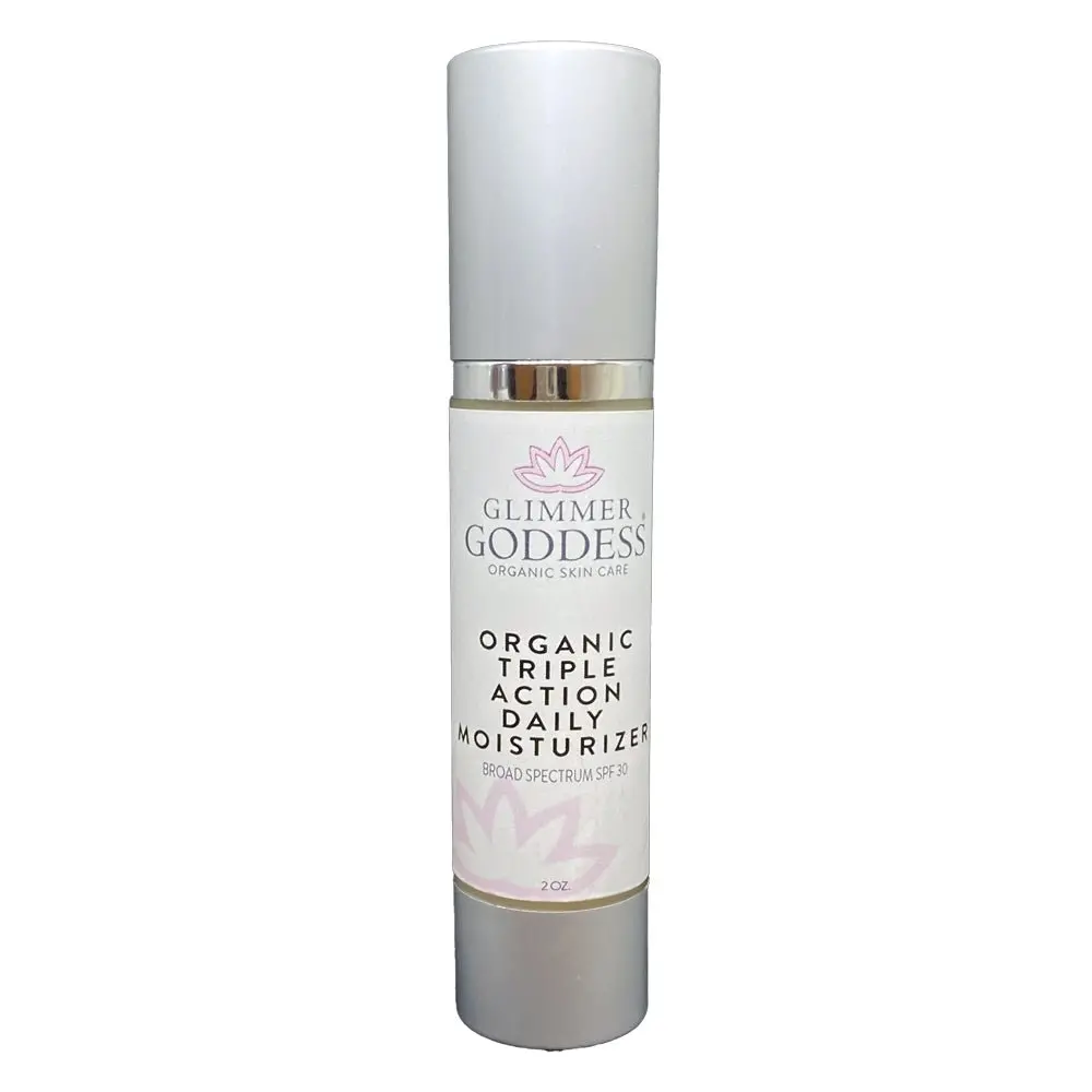Discover our Triple Action Daily Organic Face Cream SPF 30. This organic facial moisturizer combats wrinkles and shields your skin from the sun. With powerful carrot seed, pomegranate, and raspberry oils, this lightweight cream provides intense hydration and stimulates collagen production.