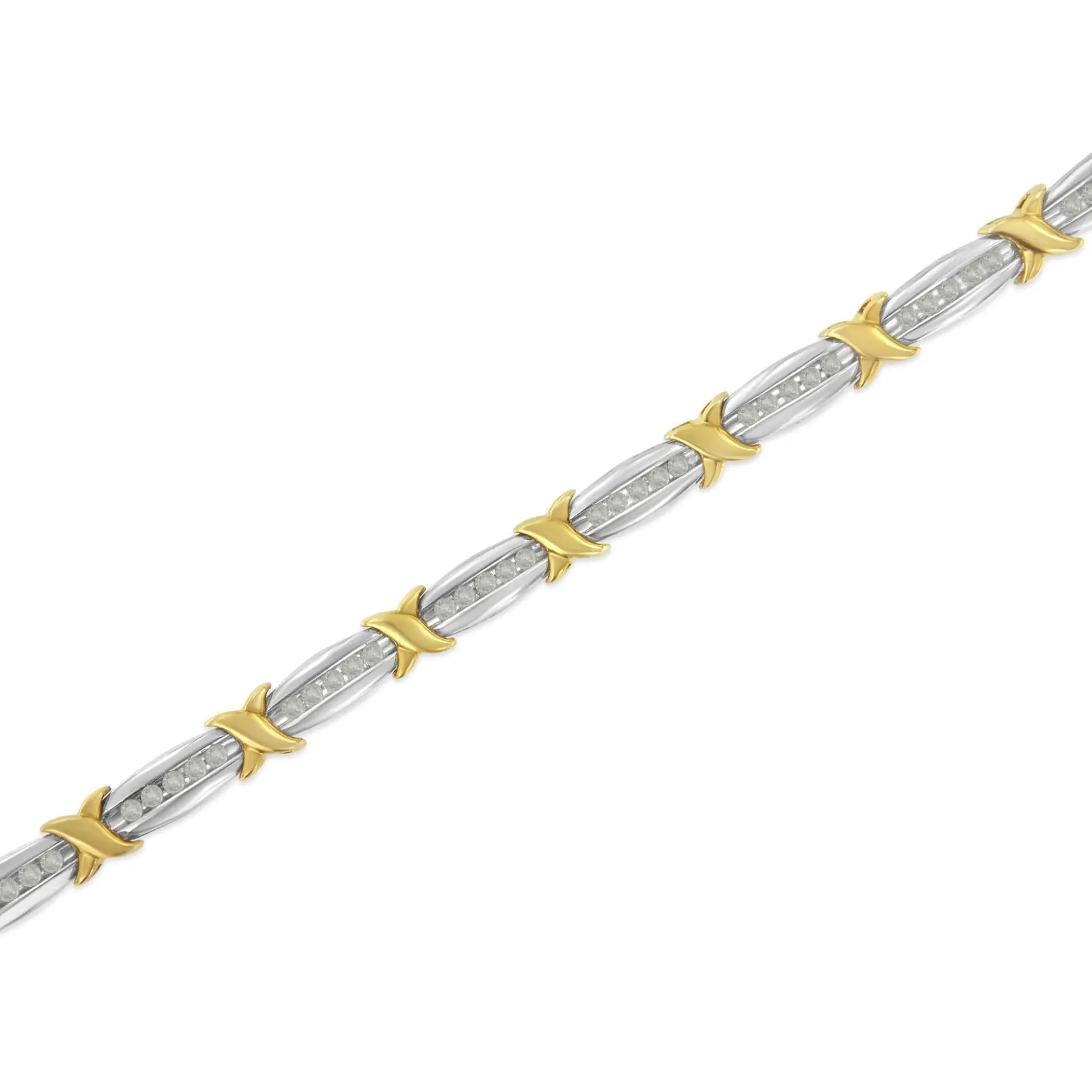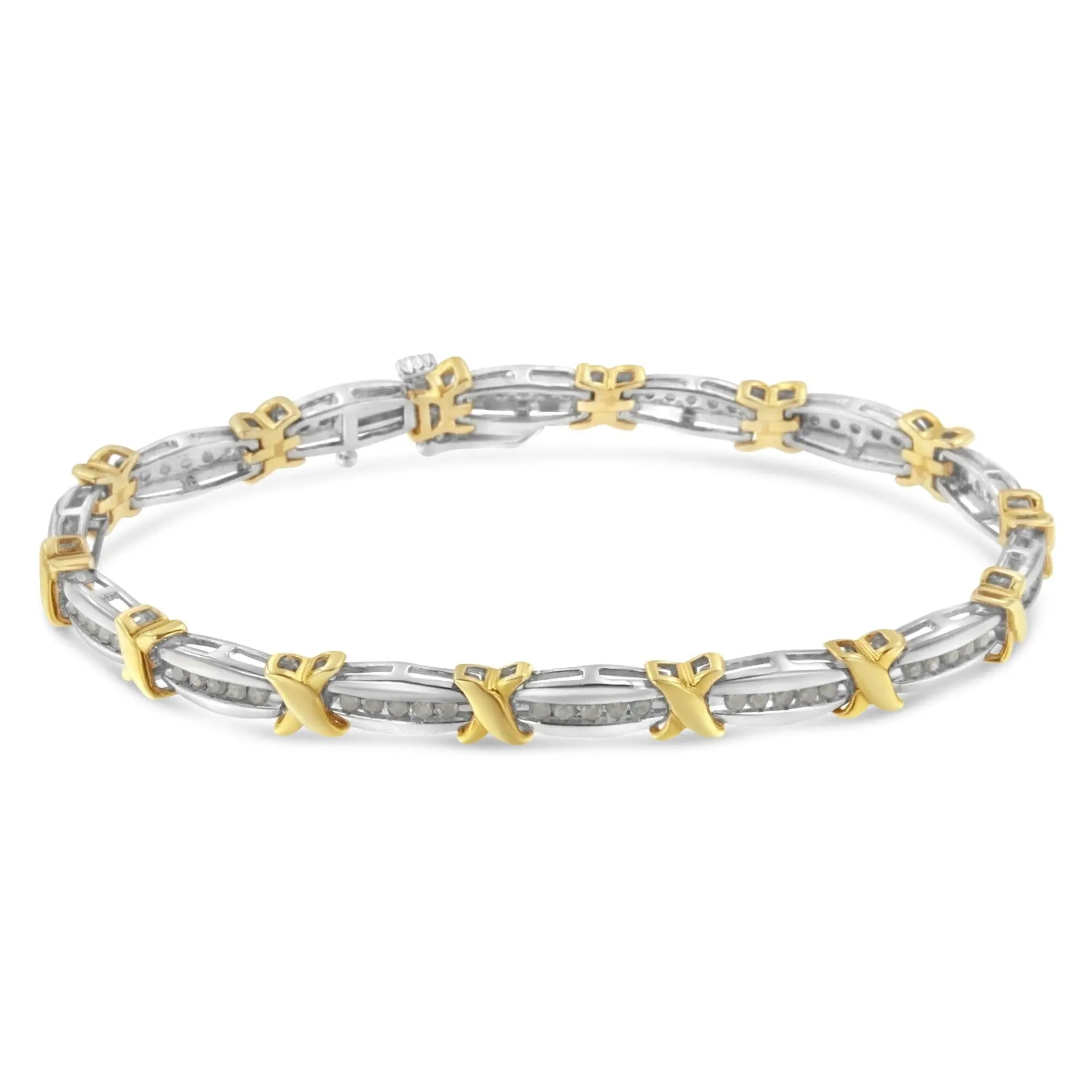 Elegant and timeless, this gorgeous .925 sterling silver tennis bracelet features 1.0 carat total weight of round, rose-cut diamonds channel set into tapered links. These tapered links alternate with X shaped links. The 7 bracelet fastens safely with a box with tongue and security lock clasp. The bracelet comes in two tone 10K yellow gold coated silver with H-I color diamonds and plain silver with I-J color diamonds. This authentic design is crafted of real 92.5% sterling silver that has been electro-coated with genuine rhodium (a platinum-family metal) or 10K yellow gold, ensuring it will keep a tarnish-free shine for years to come. This classic, slender tennis bracelet makes a great gift for any special occasion. Diamonds are thought to give the wearer clarity and illuminate solutions to lifes problems, as well as encouraging abundance, strength, courage, harmony, faithfulness, and commitment. Give her a gift that will perfectly complement her favorite ensemble.