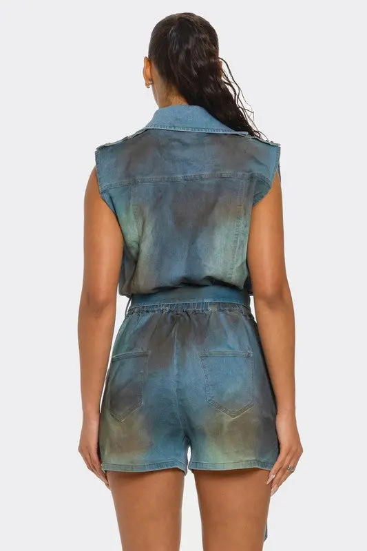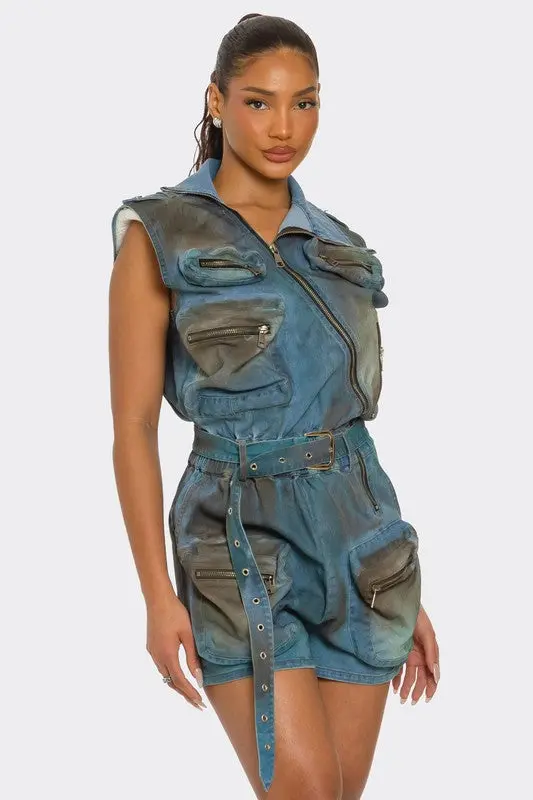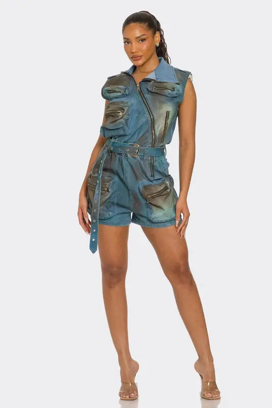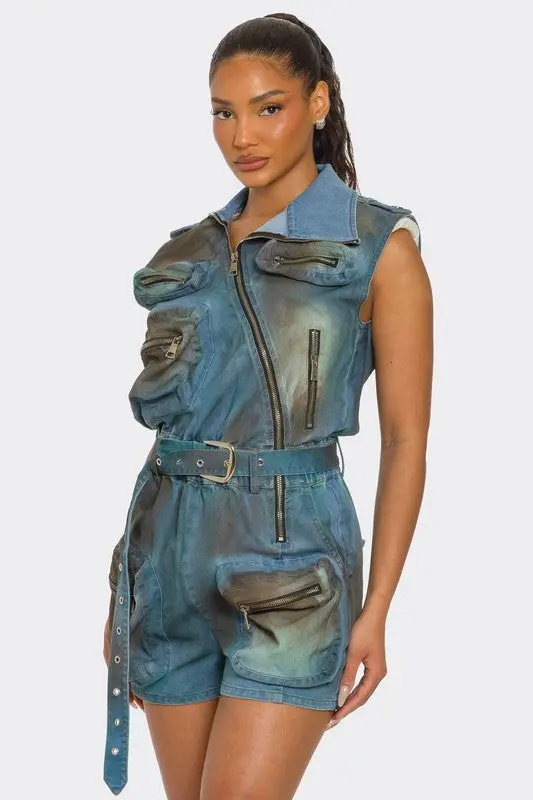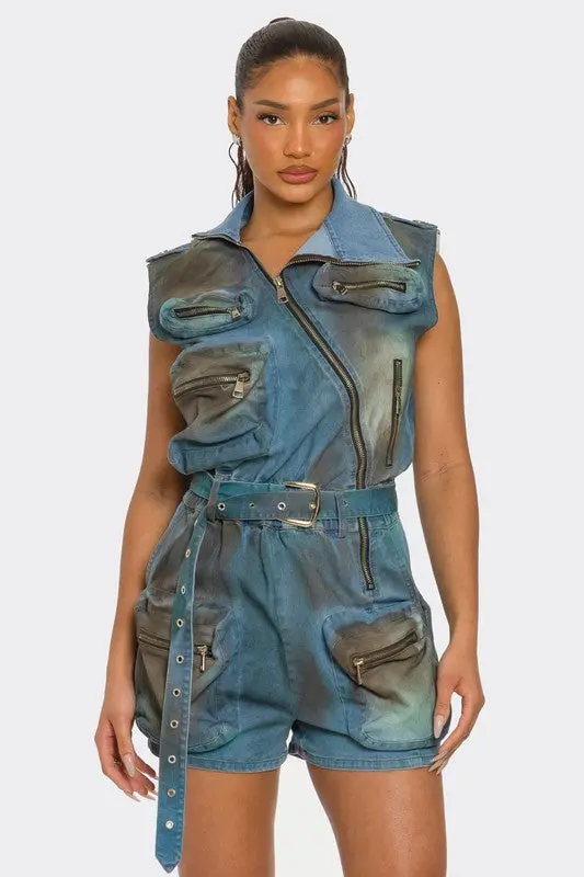 Step up your street-style game with the Urban Edge Zipper Utility Romper, a bold fusion of edgy design and effortless cool. Crafted in a unique ombre-wash denim, this sleeveless romper features an asymmetrical zip-front closure and multiple zippered utility pockets for a rugged, moto-inspired look. The cinched waist with a statement belt enhances your silhouette, while the relaxed-fit shorts add comfort and movement.