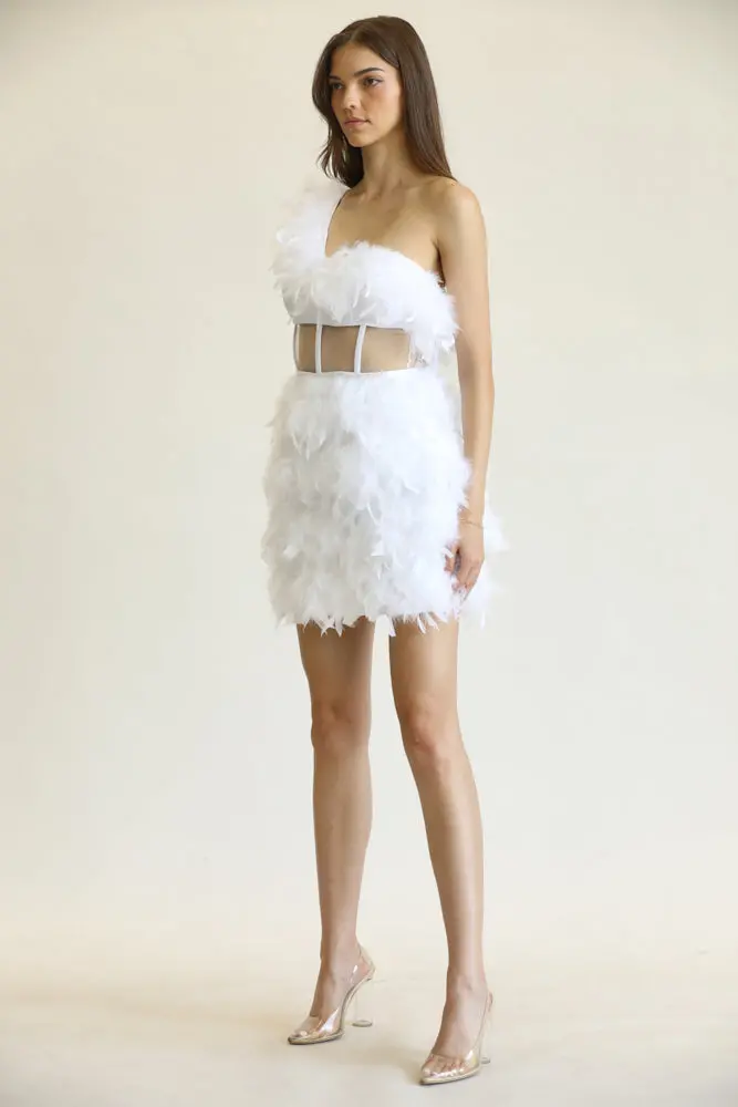 – ONE-SHOULDER FEATHER TRIM DETAILING