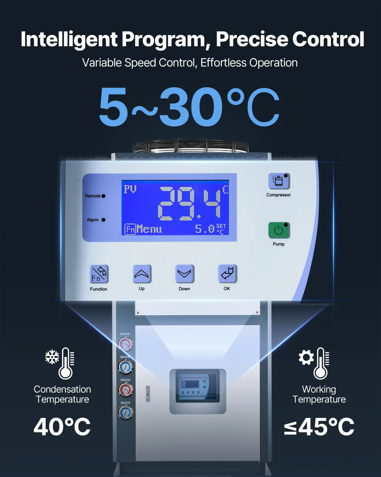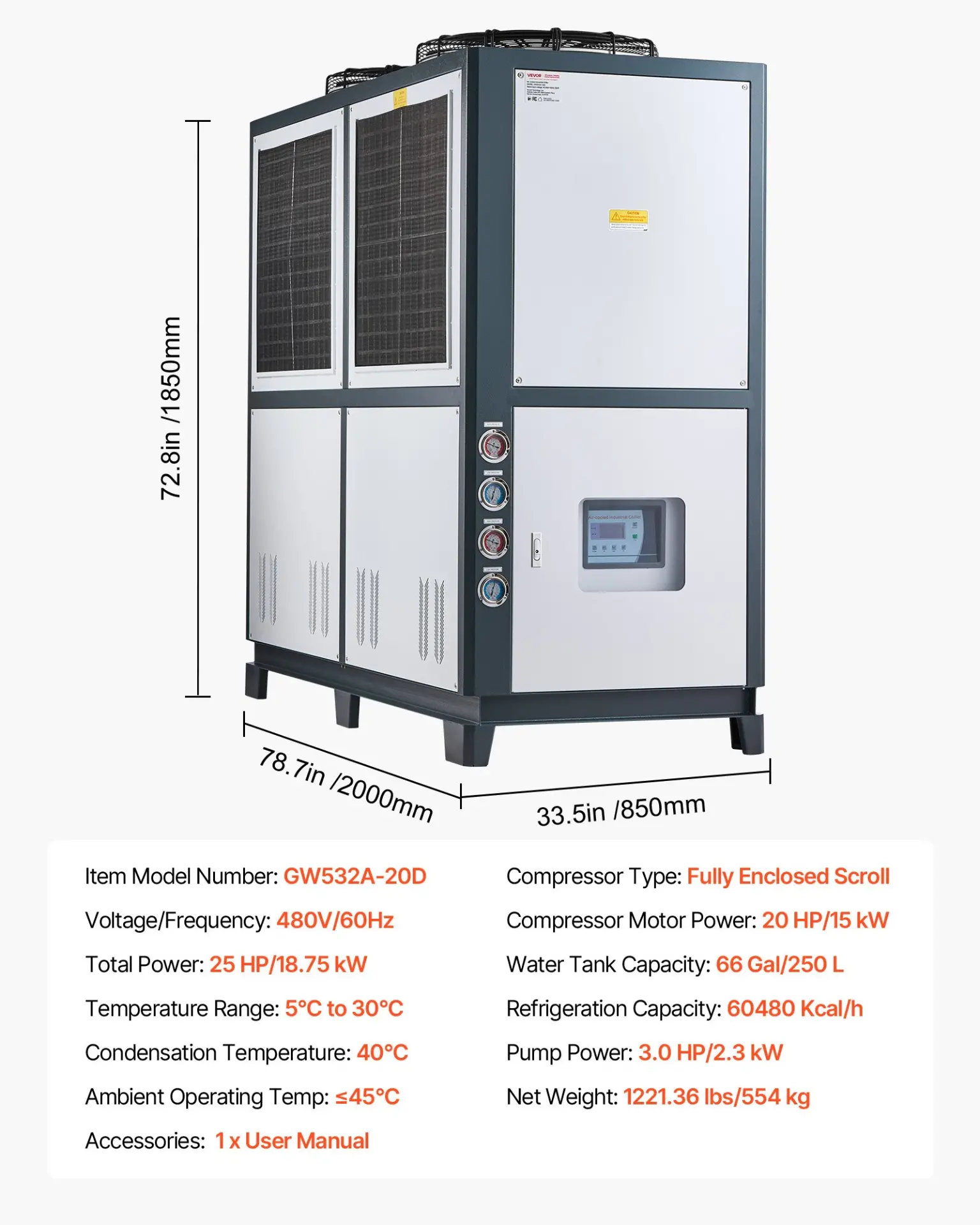 Ambient Operating Temp: 45,Voltage/Frequency: 480V/60Hz,Compressor Type: Fully Enclosed Scroll,Water Tank Capacity: 66 Gal/250 L,Total Power: 25 HP/18.75 kW,Pump Power: 3.0 HP/2.3 kW,Item Model Number: GW532A-20D,Temperature Range: 5 to 30,Compressor Motor Power: 20 HP/15 kW,Cooling Capacity: 60480 Kcal/h,Condensation Temperature: 40