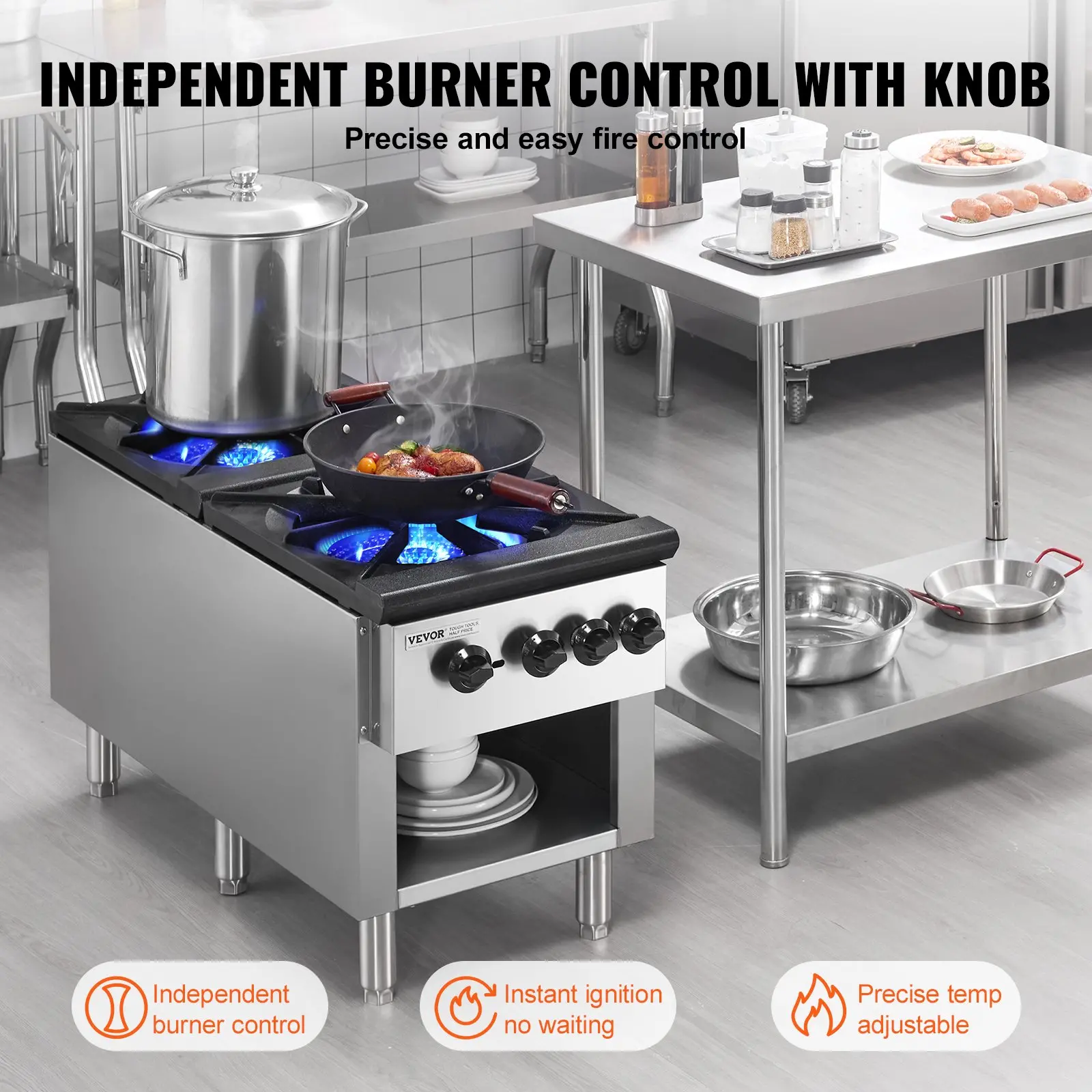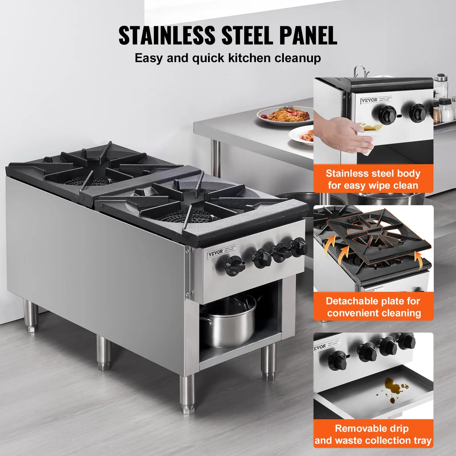 VEVOR Commercial Gas Stove with 2 Burners, Propane and Natural Gas Countertop Cooking Stove Range, Stainless Steel Gas Hot Plate, Commercial Cooking Equipment for Restaurant, 180,000 BTU