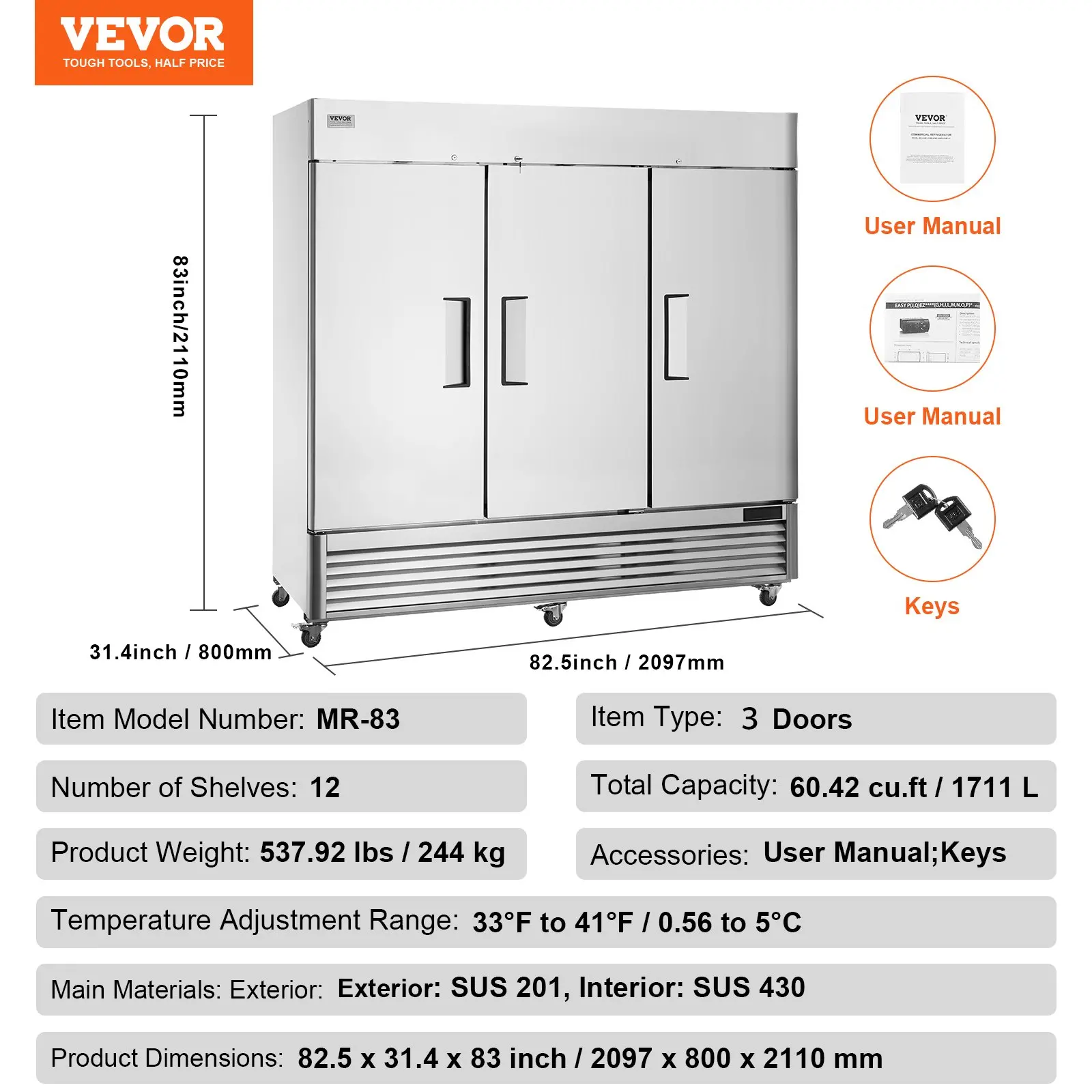 Number of Shelves: 12,Temperature Adjustment Range: 33 to 41 / 0.56 to 5 C,Main Materials: Exterior: SUS 201, Interior: SUS 430,Total Capacity: 60.42 Cu.ft / 1711,Item Model Number: MR-83,Product Weight: 537.92 lbs / 244 kg,Item Type: 3 Doors,Product Dimensions: 82.5 x 31.4 x 83 inch / 2097 x 800 x 2110 mm
