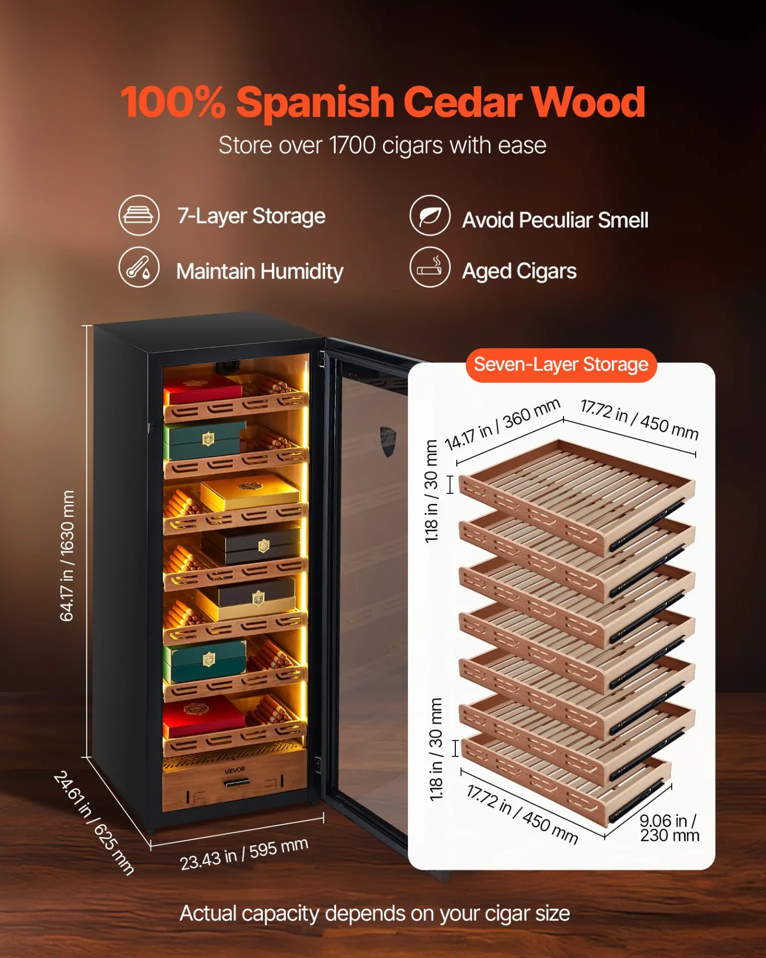 VEVOR Electric Humidor, 288L, 1700 Counts Electric Cigar Humidor Cabinet with Compressor Cooling, Constant Humidity & Temperature Control, Spanish Cedar Wood Shelves & Drawers, 7 Layers, for Household