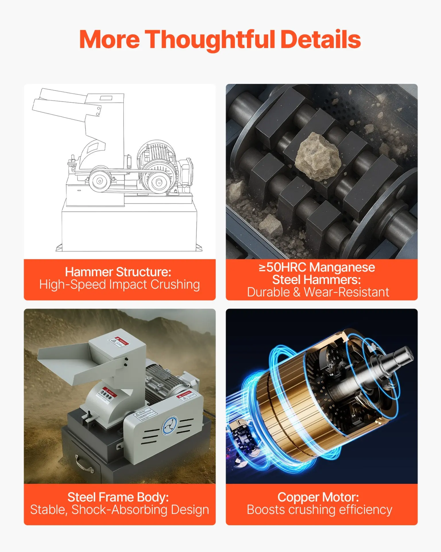 VEVOR Hammer Crusher, 3KW 220V Electric Rock Stone Shatter Grinder, Glass Crushing Machine with 400 to 600 kg/h Crushing Capacity, Coal Crusher Milling Machine with 0.12/0.24/0.4 inch Sieve Screens