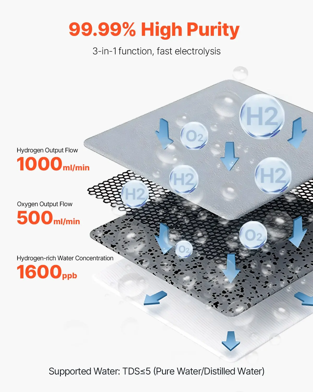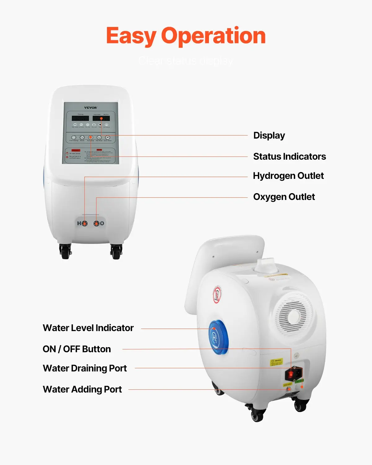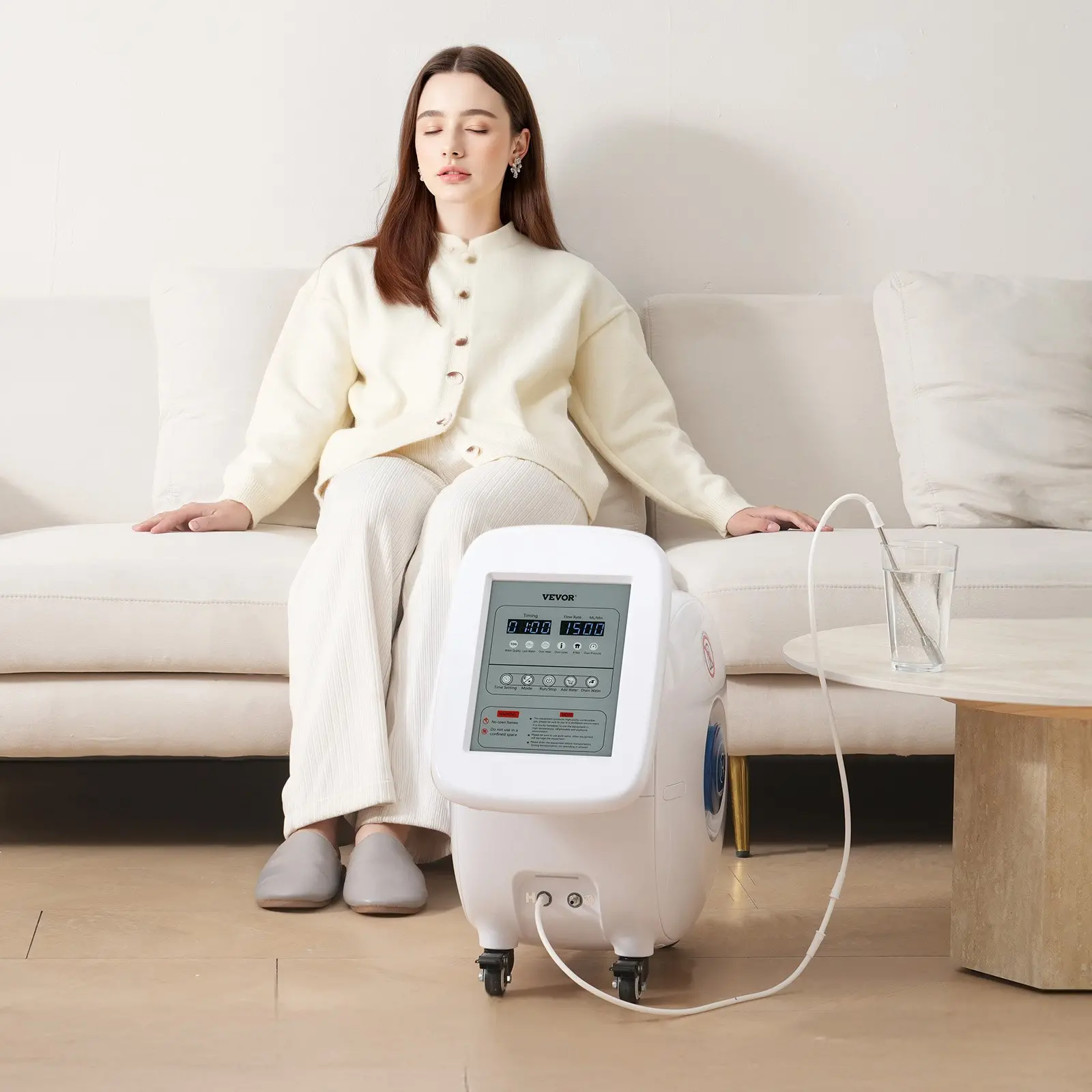 VEVOR Hydrogen Inhalation Machine, 99.99% High Purity Hydrogen Inhaler, HO-Separated 1500ml/min (1000 H+500 O) Dual Port Hydrogen Oxygen Inhaler, Hydrogen-Rich Water Generator with Wheels for Home