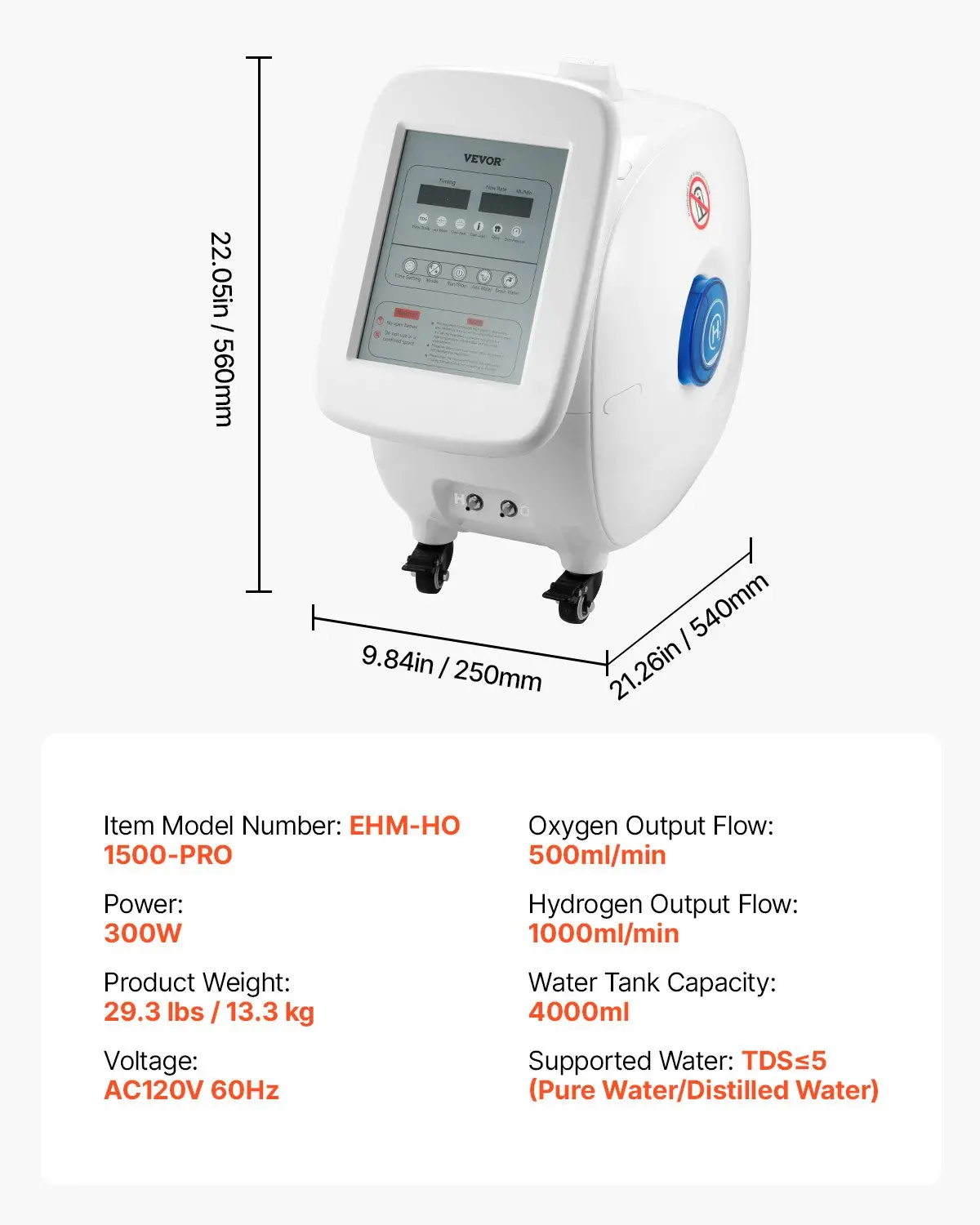 Supported Water: TDS5 (Pure Water/Distilled Water),Oxygen Output Flow: 500ml/min,Water Tank Capacity: 4000ml,Voltage: AC120V 60Hz,Item Model Number: EHM-HO1500-PRO,Product Weight: 29.3 lbs / 13.3 kg,Product Dimensions: 9.84 x 21.26 x 22.05 in / 250 x 540 x 560 mm,Hydrogen Output Flow: 1000ml/min,Power: 300W