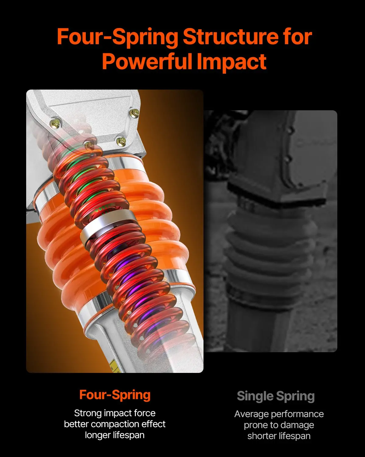 VEVOR Jumping Jack Compactor, 6.5 HP Vibratory Rammer Fuel-Powered 196 cc Engine Tamper, 3600 lbs Impact Force, 26″ Max Compaction Depth, Four-Spring, for Soil, Gravel, Concrete Slabs, Foundations