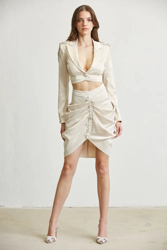 – RHINSTONE EMBELLISHED SHOULDERS + PADDING