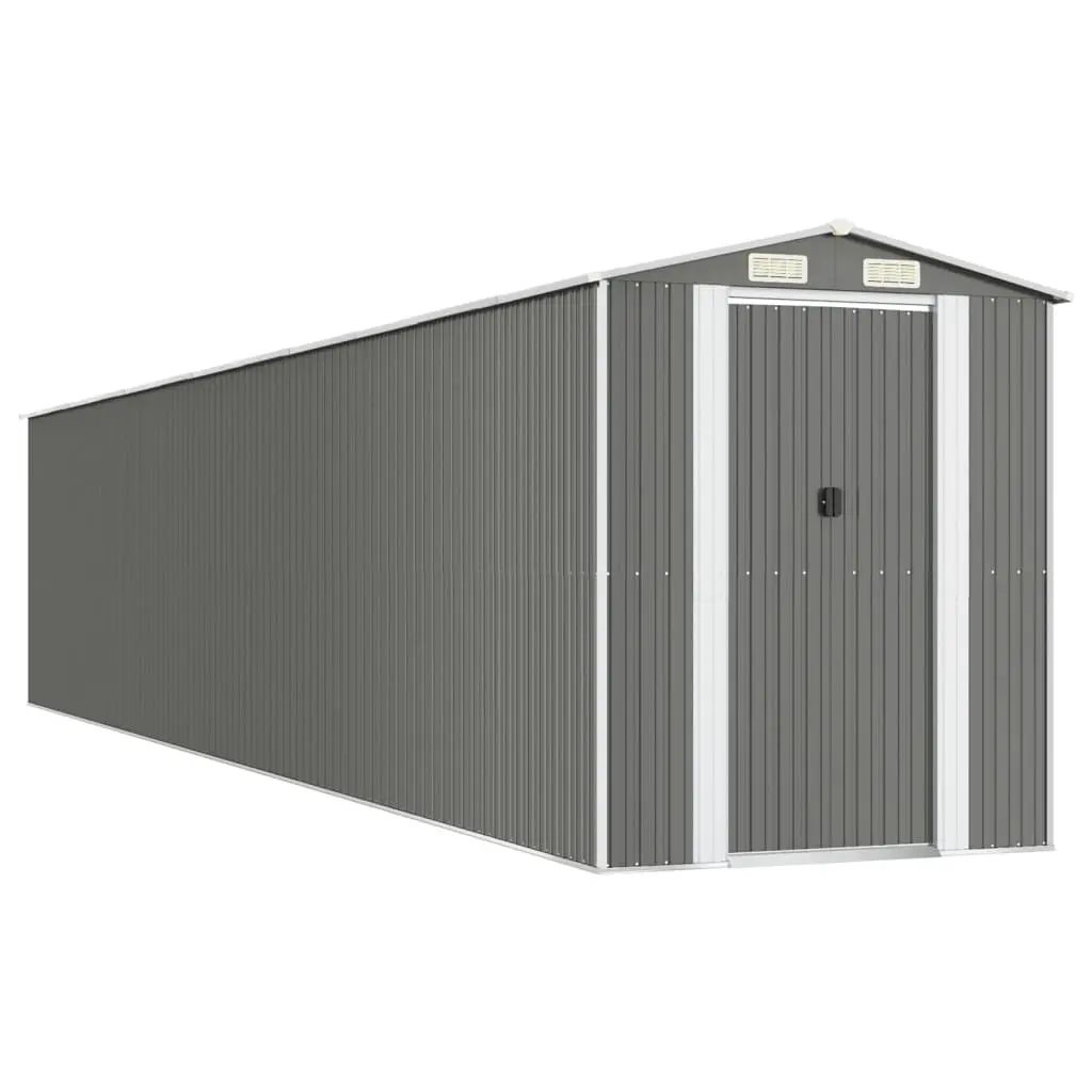 This light gray garden shed is a spacious solution for your outdoor storage needs, made from durable galvanized steel to withstand the elements. Its industrial design isnt just functional but also adds a modern look to your backyard, perfectly blending style with usefulness.