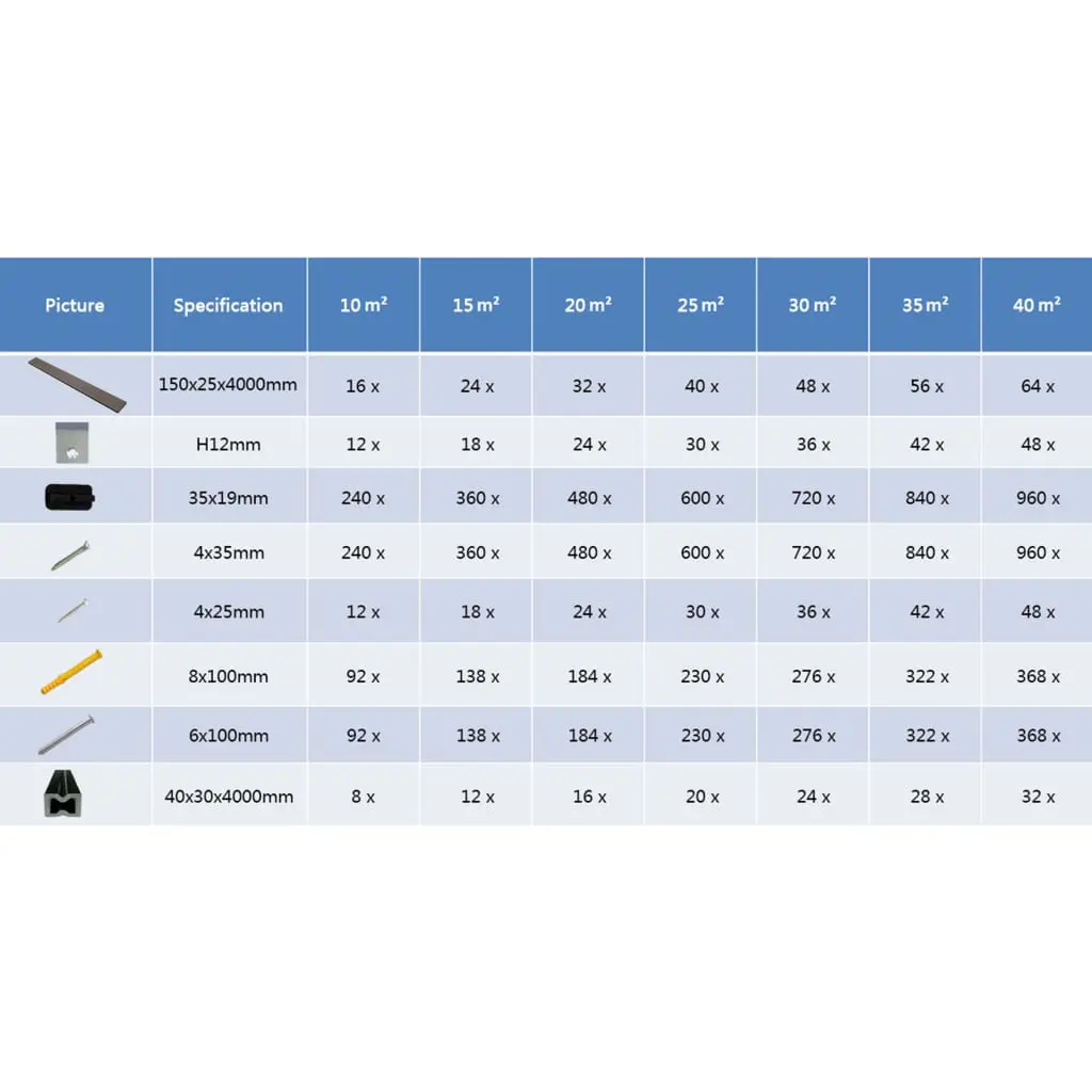 Made of quality wood plastic composite, our decking boards are water proof and very durable. The decking boards are thick at 0.98 “, making them super strong. In addition, these decking boards have a different pattern on each side. Delivery includes 32 decking boards, 16 keels, 480 plastic clips, 504 stainless steel screws, 184 plastic expansion screws and 24 stainless steel starter clips. This set is easy to assemble.