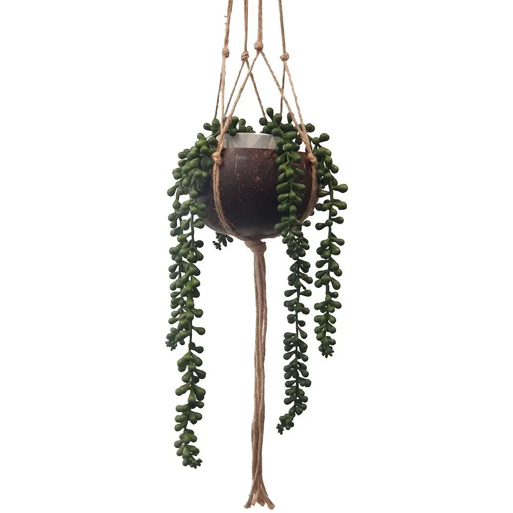Vie Naturals Coconut Shell Pot Holder with a Sturdy Jute Macrame Style Hanging Rope Brown