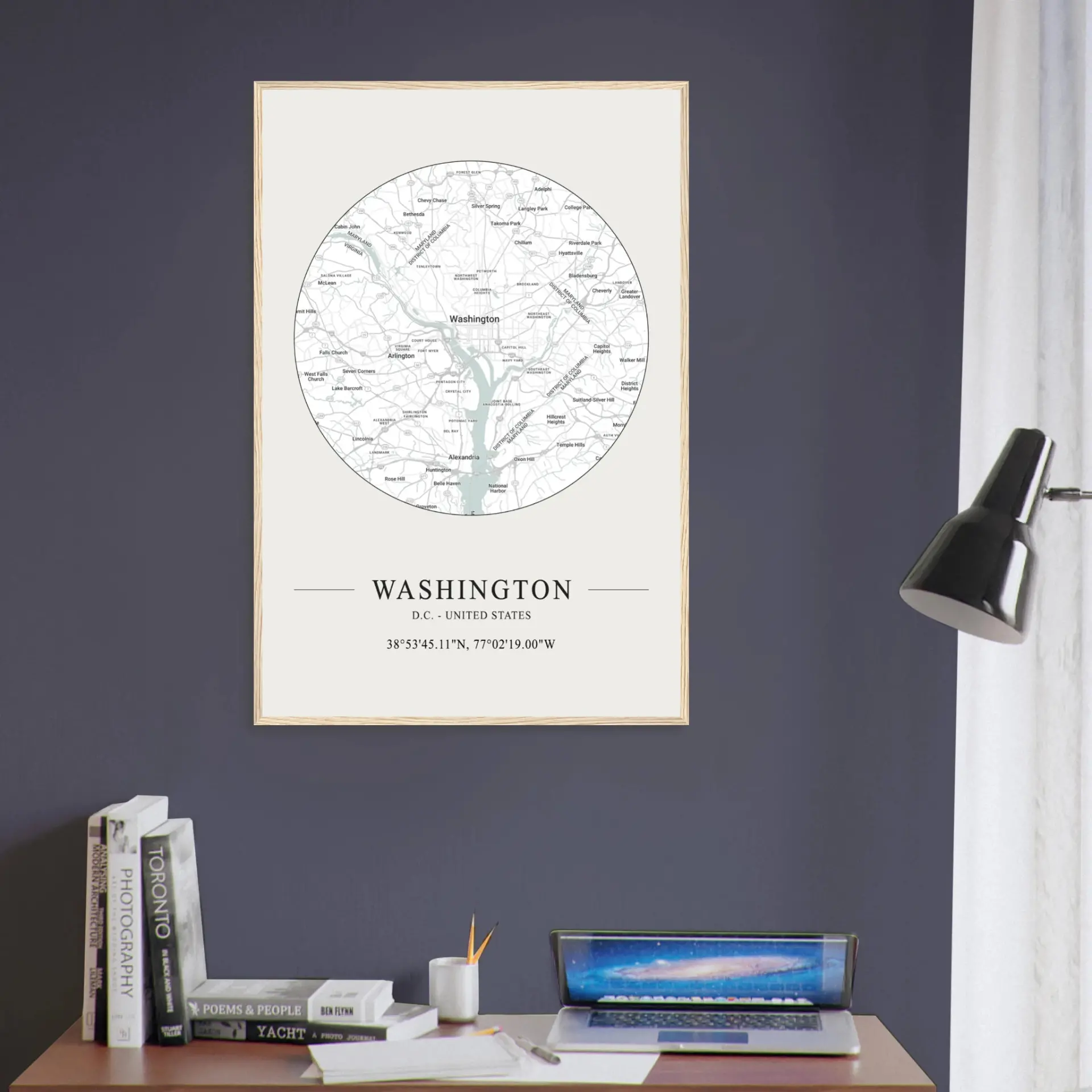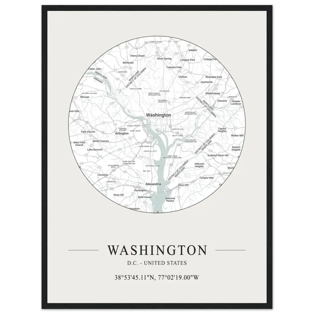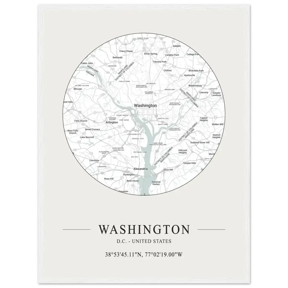 Elevate your decor with this minimalist city map poster of Washington, D.C. Featuring the detailed street grid and landmarks of the capital, this contemporary design celebrates the city’s unique layout and rich history. Ideal for any space, it brings a modern and sophisticated touch, making it a perfect gift for map lovers and fans of the nation’s capital.