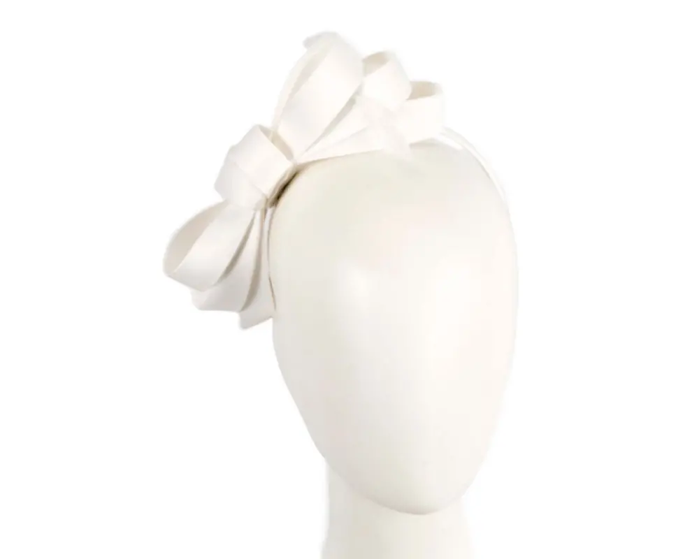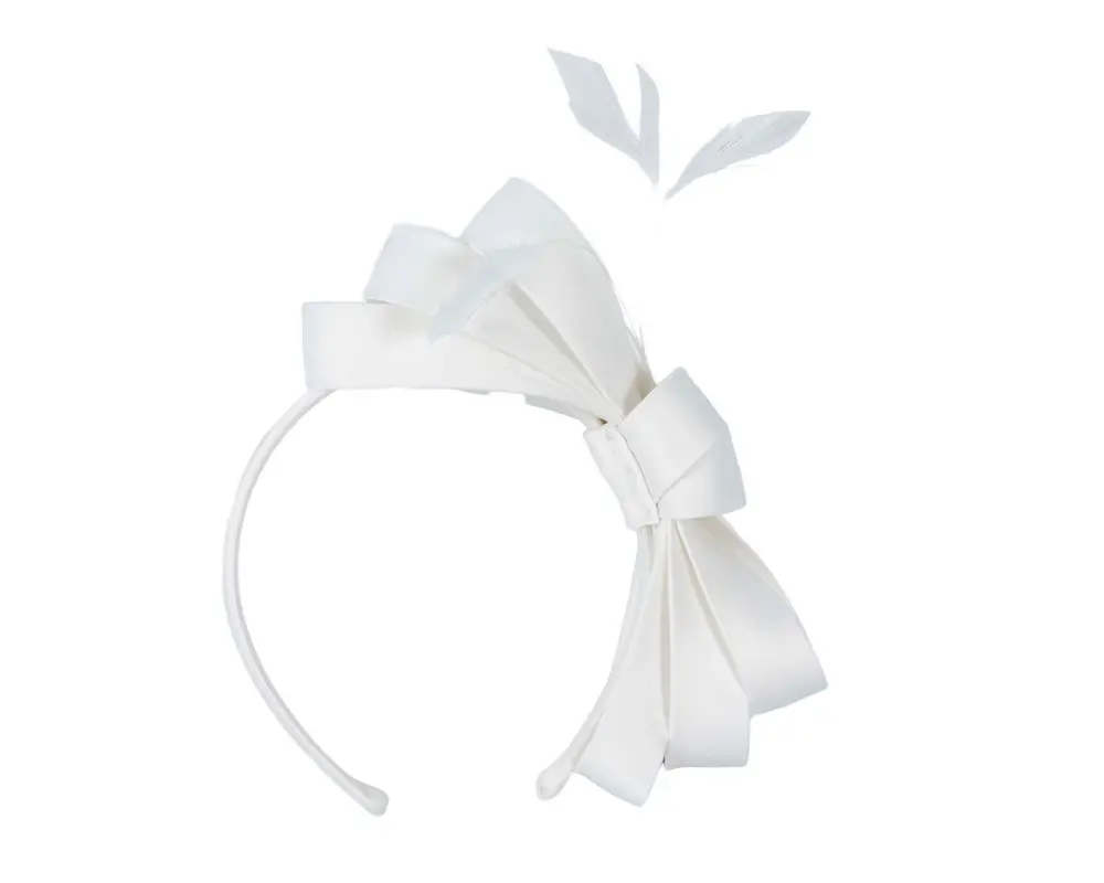 Stylish white bow fascinator with soft feathers from latest Max Alexander racing collection.