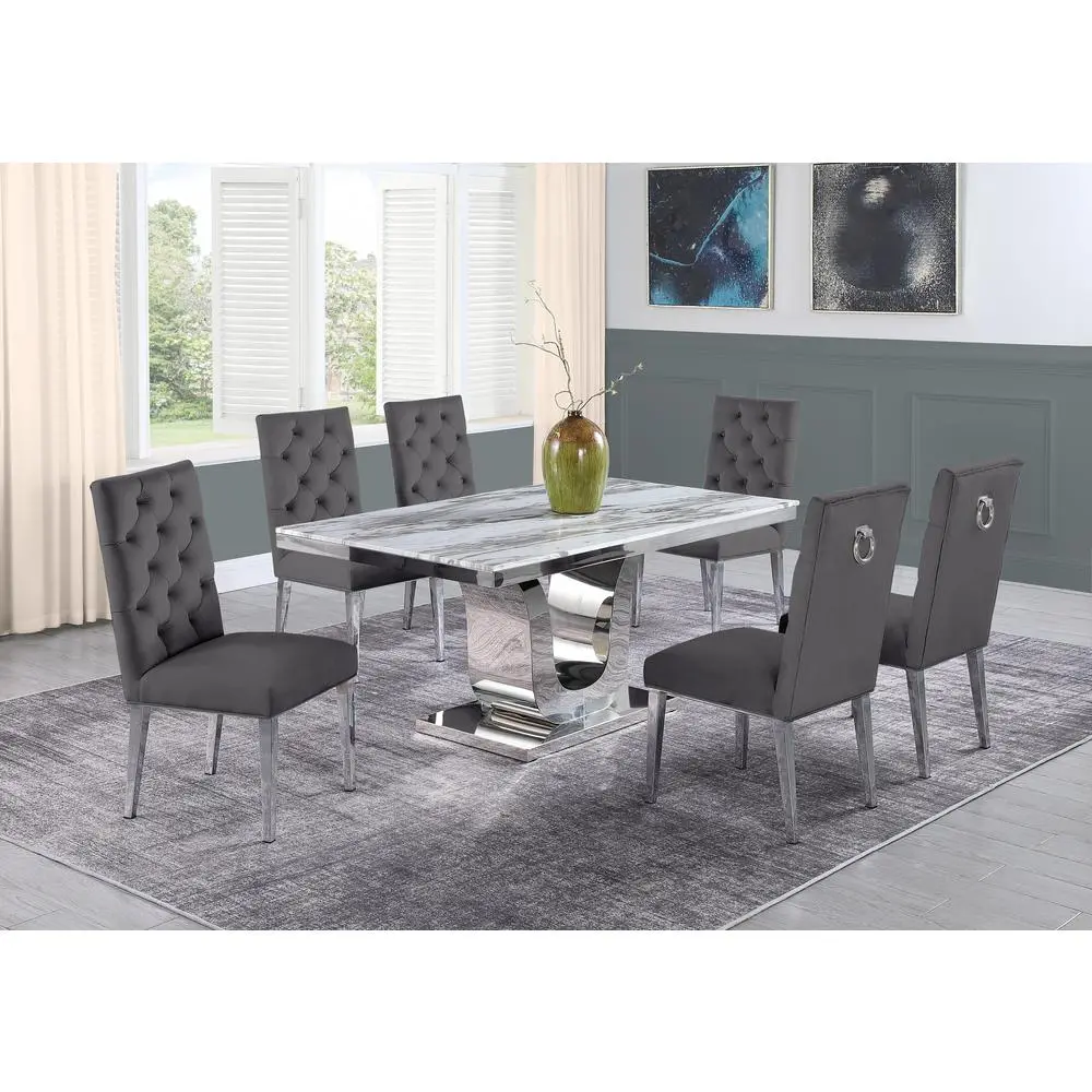 Dining Set 64″L Marble Top Stainless Steel U-Base Ring Handle Chrome Chair Legs Chair Color | Dark Grey Chair Material | Velvet Available in 5 piece or 7 piece dining sets