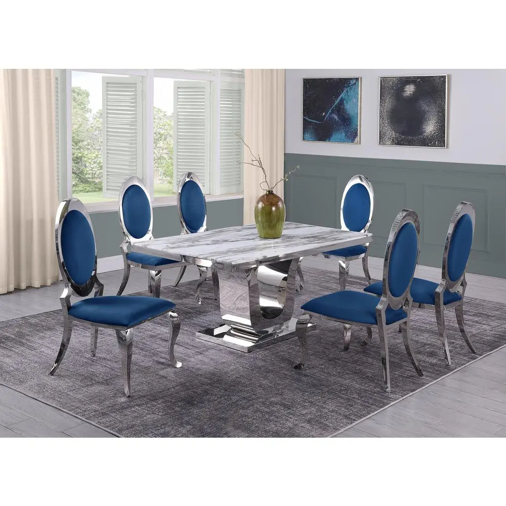 White Marble 7pc Set Stainless Steel Chairs in Navy Blue Velvet
