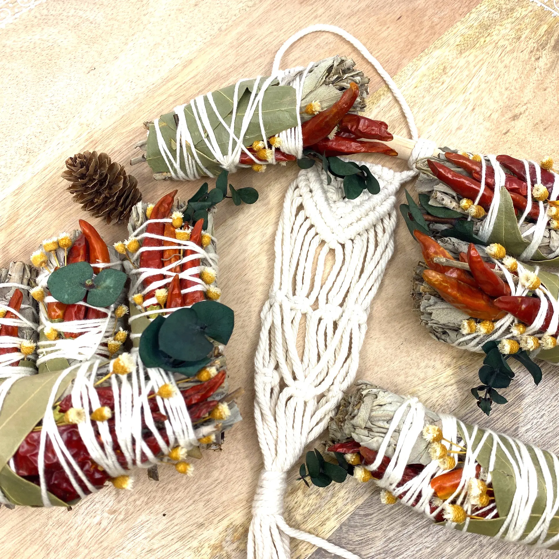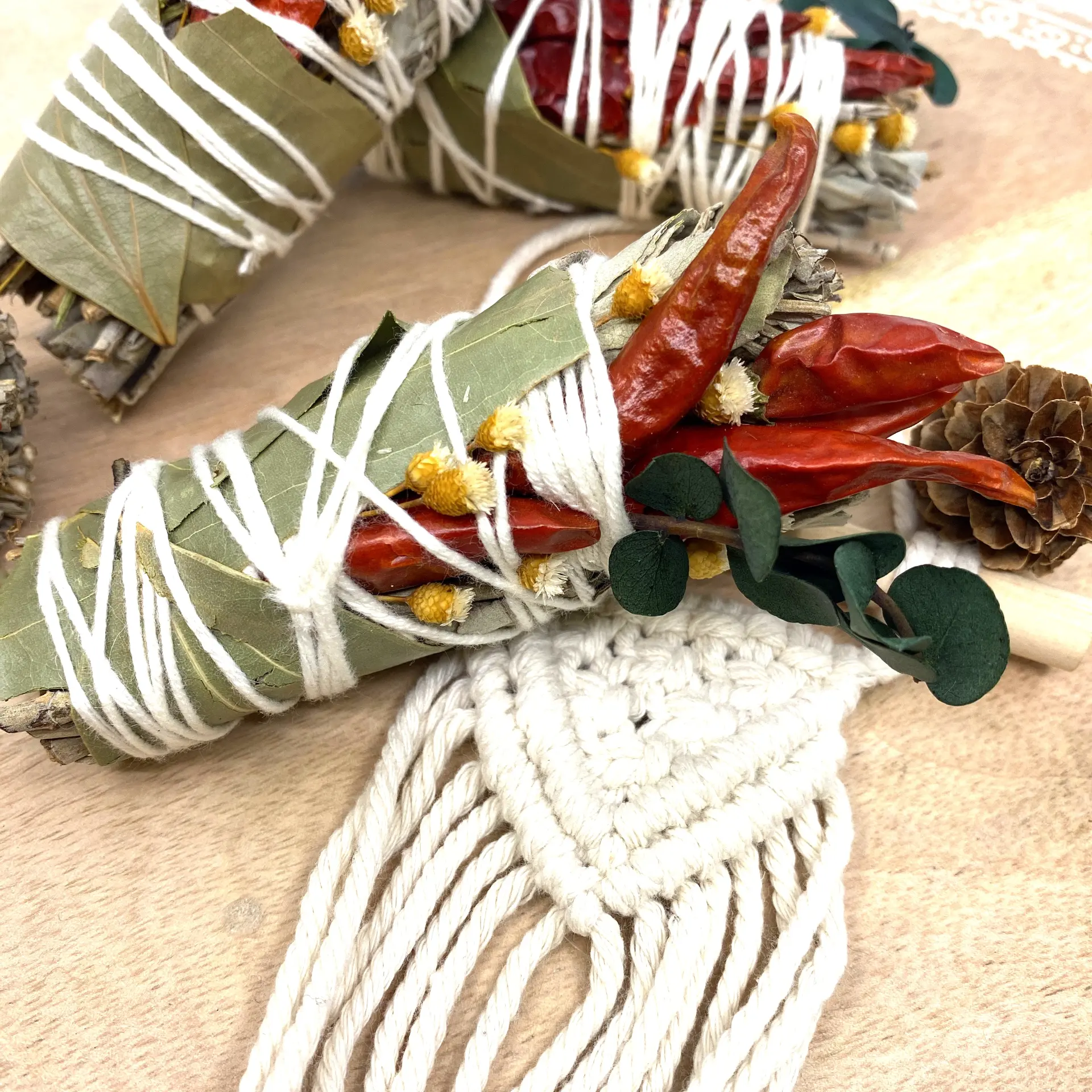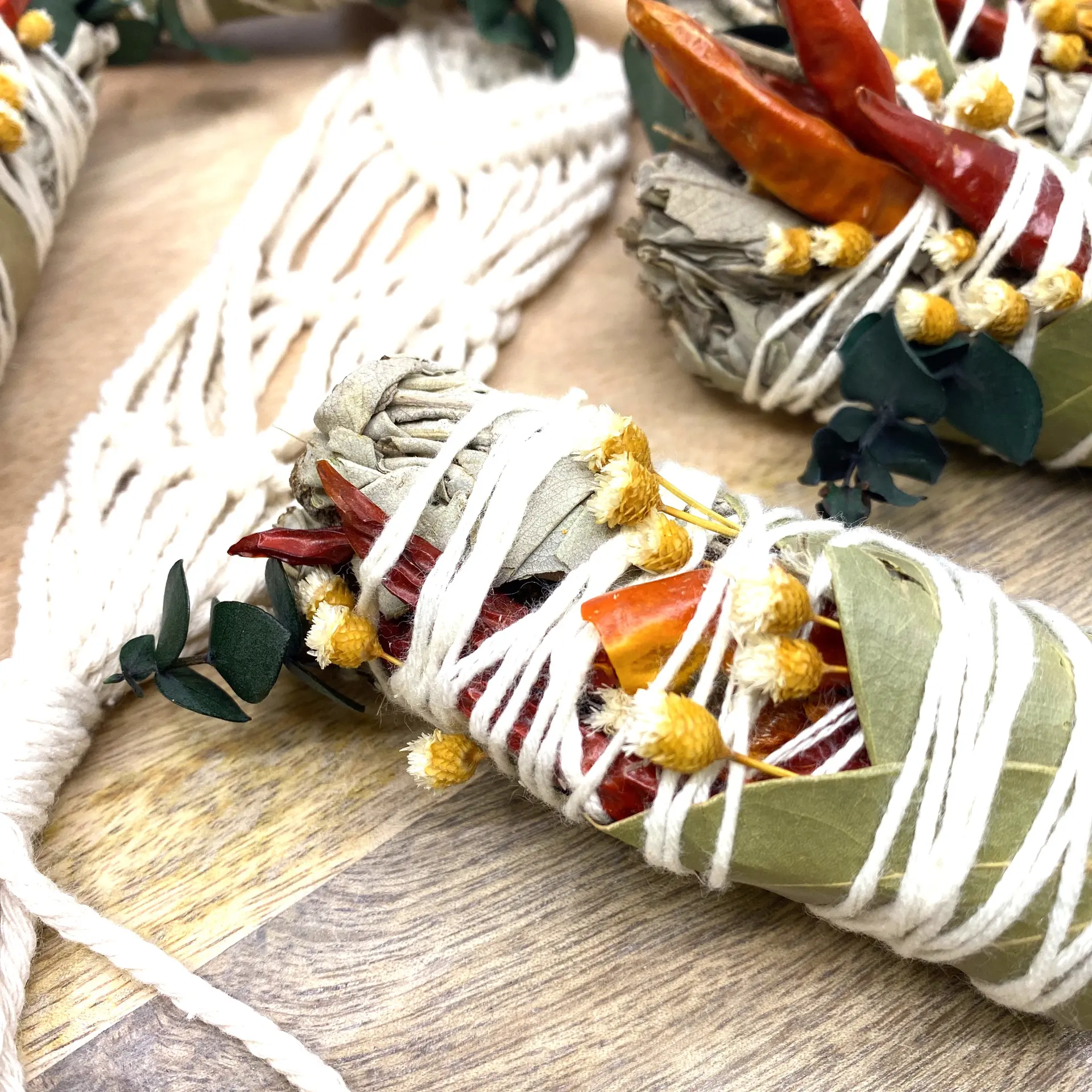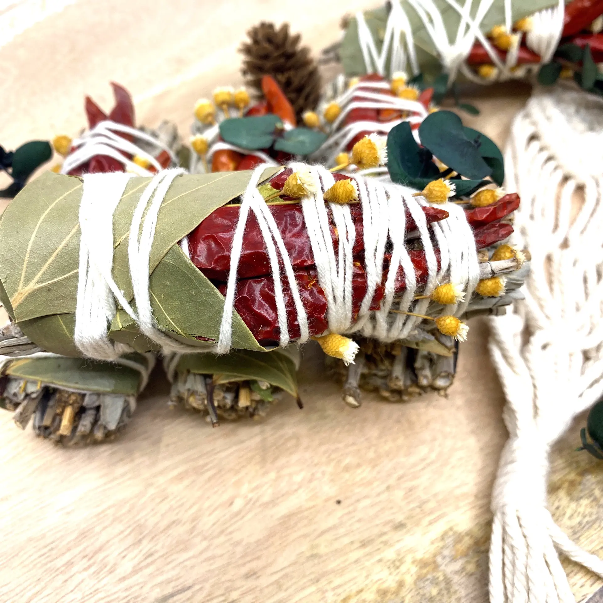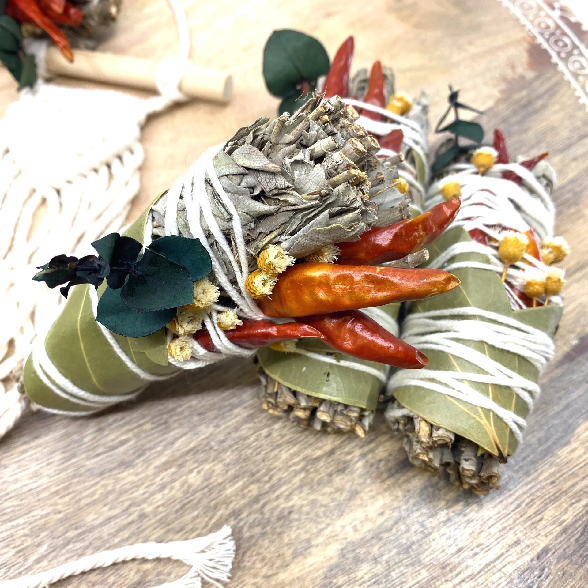 Each smudge bundle contains : Copal incense, dried white sage, dried red chili peppers, dried bay leaves, dried star daisies, and eucalyptus.