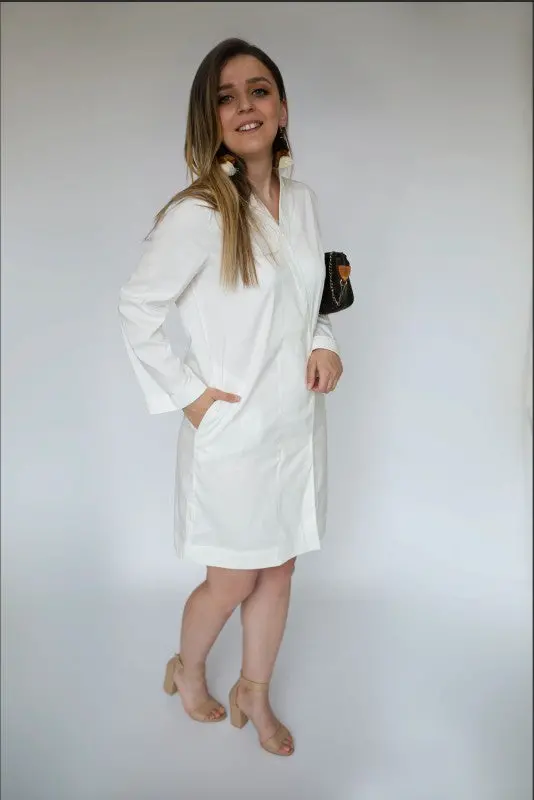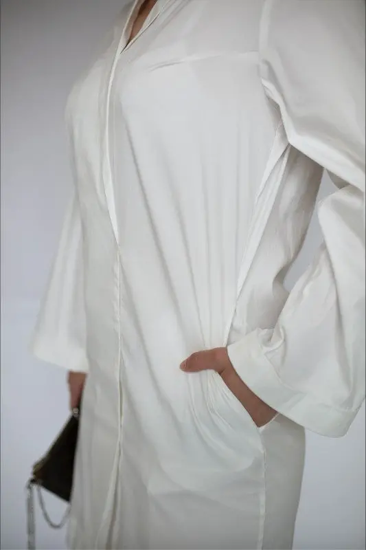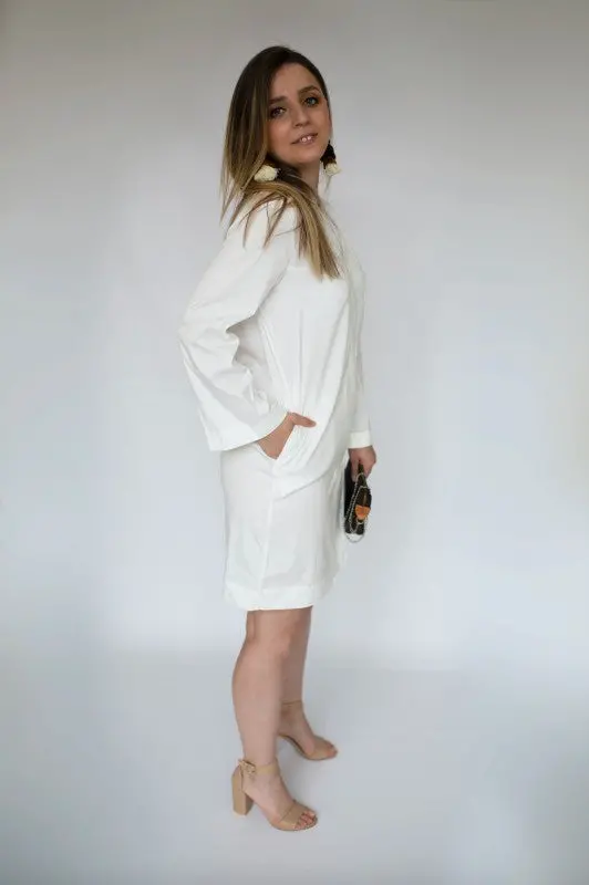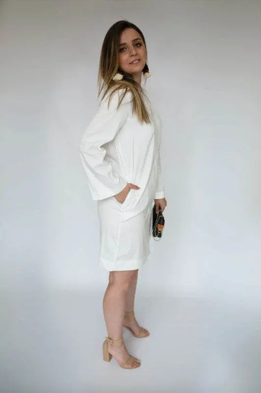 A kimono design, this dress is made from cotton with a light and crisp quality. Seam at the waist for added shape, it has wide kimono sleeves, discreet side pockets and it is completed fine, clean-cut edges.