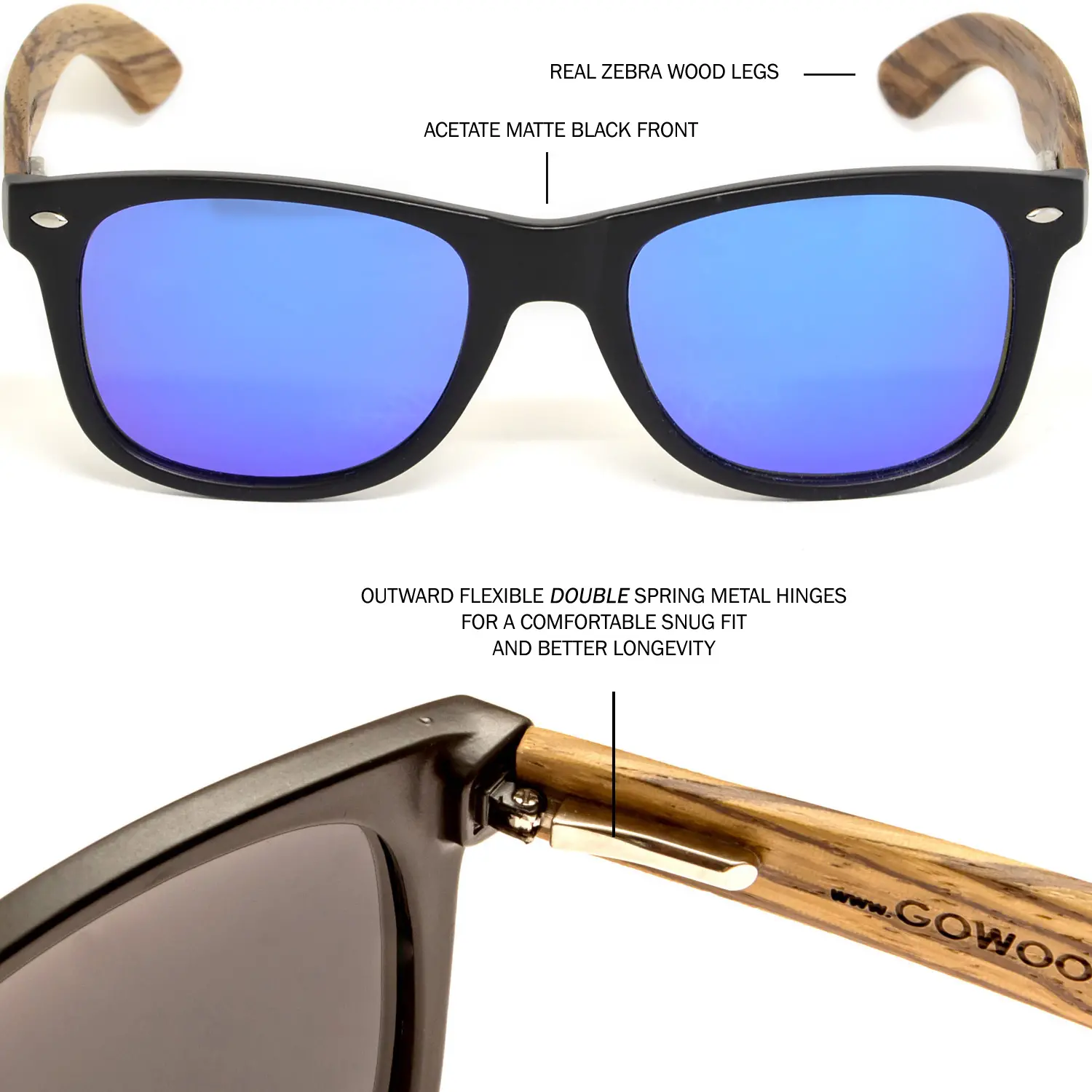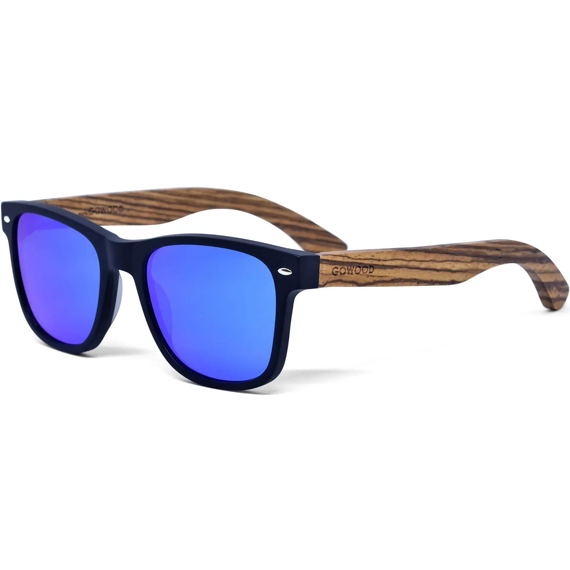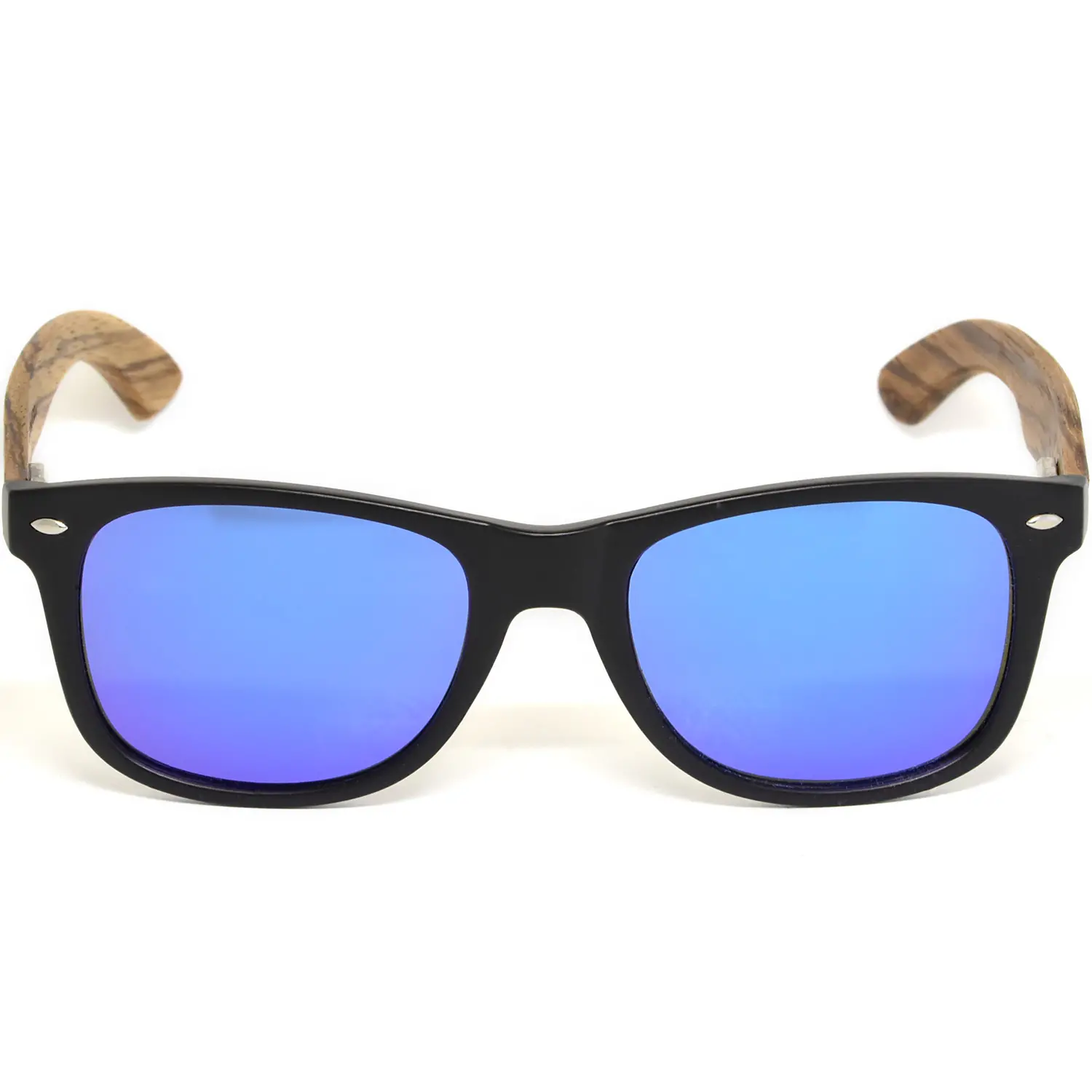 Zebra wood classic style sunglasses with matte black acetate front frame and blue mirrored polarized lenses