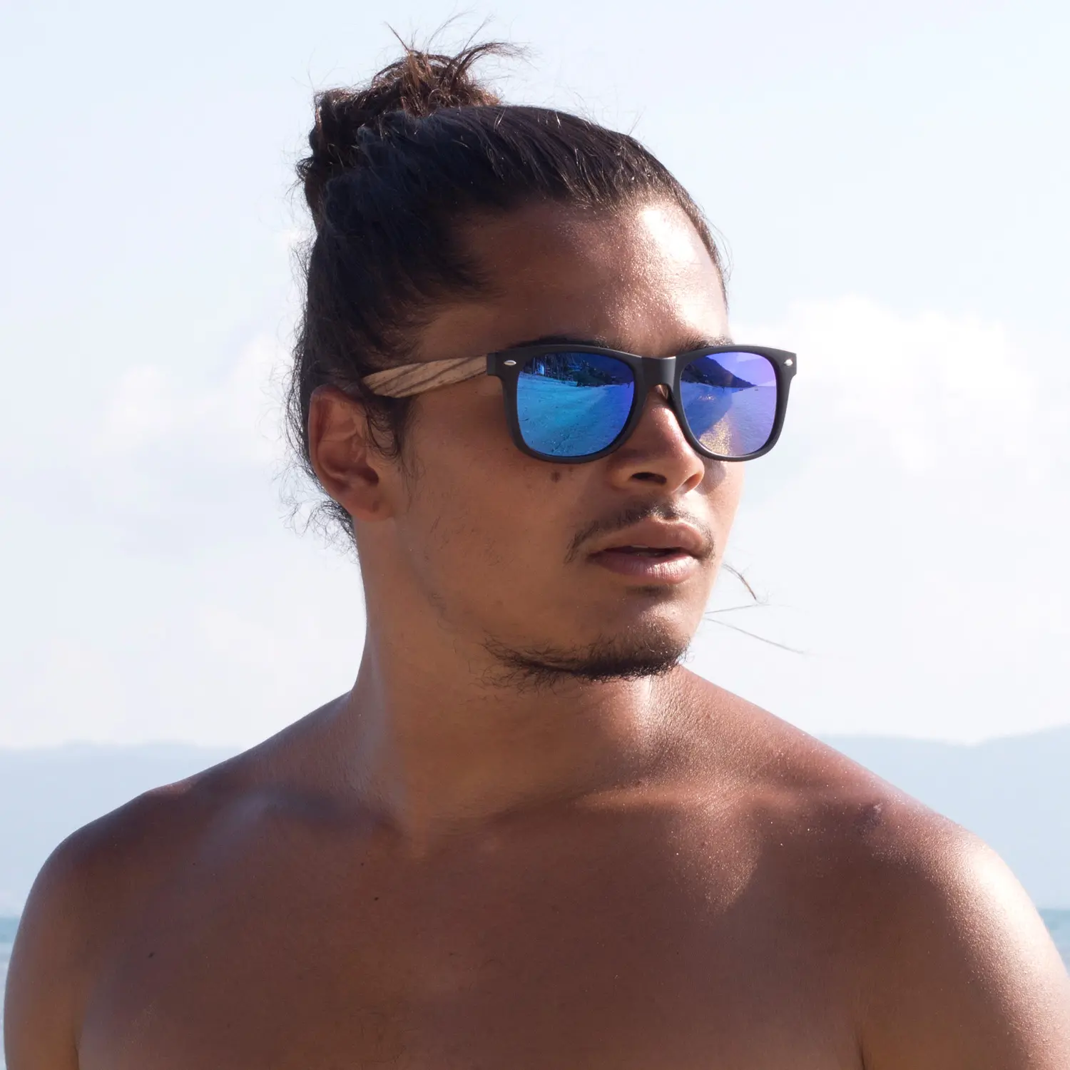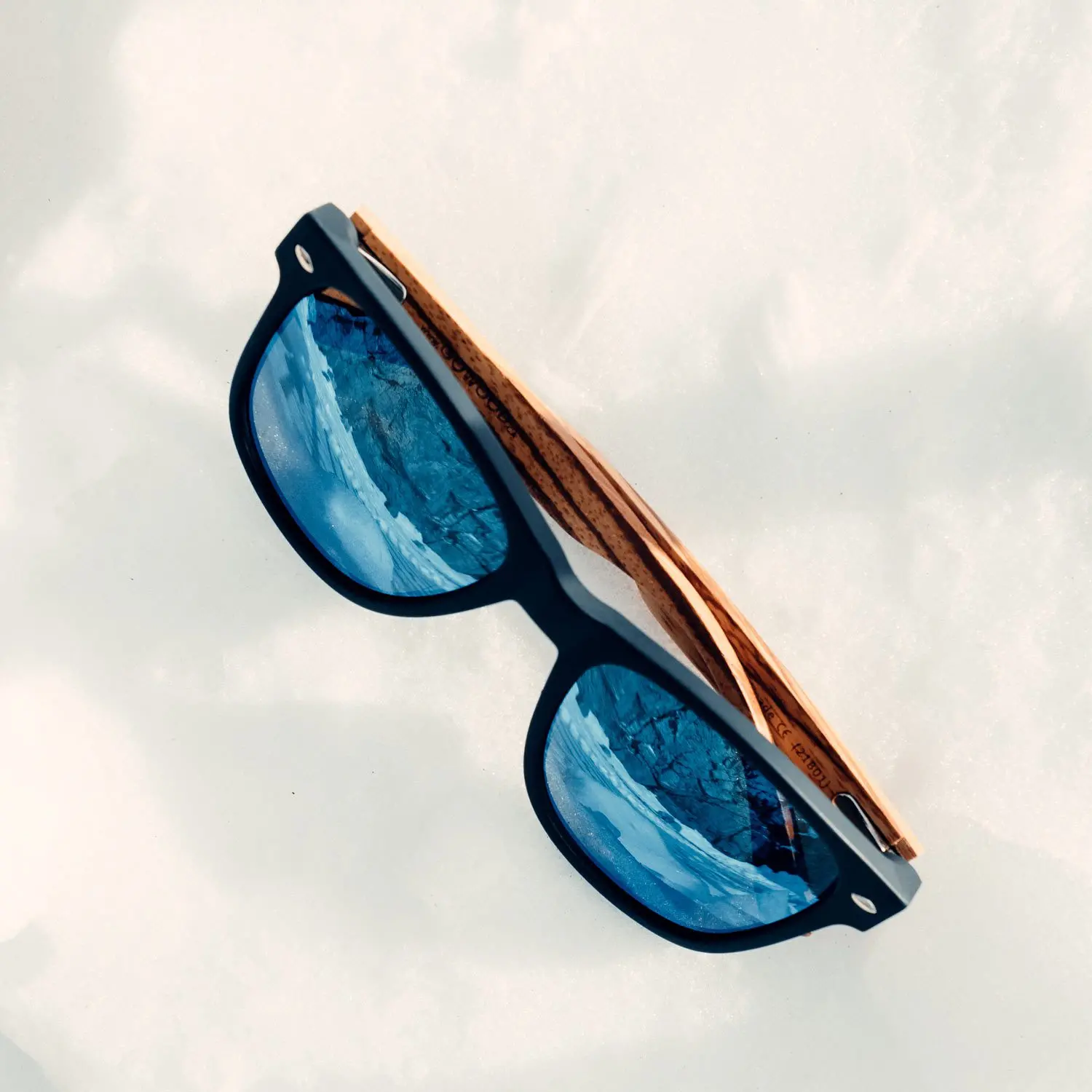 Zebra wood sunglasses with blue mirrored polarized lenses